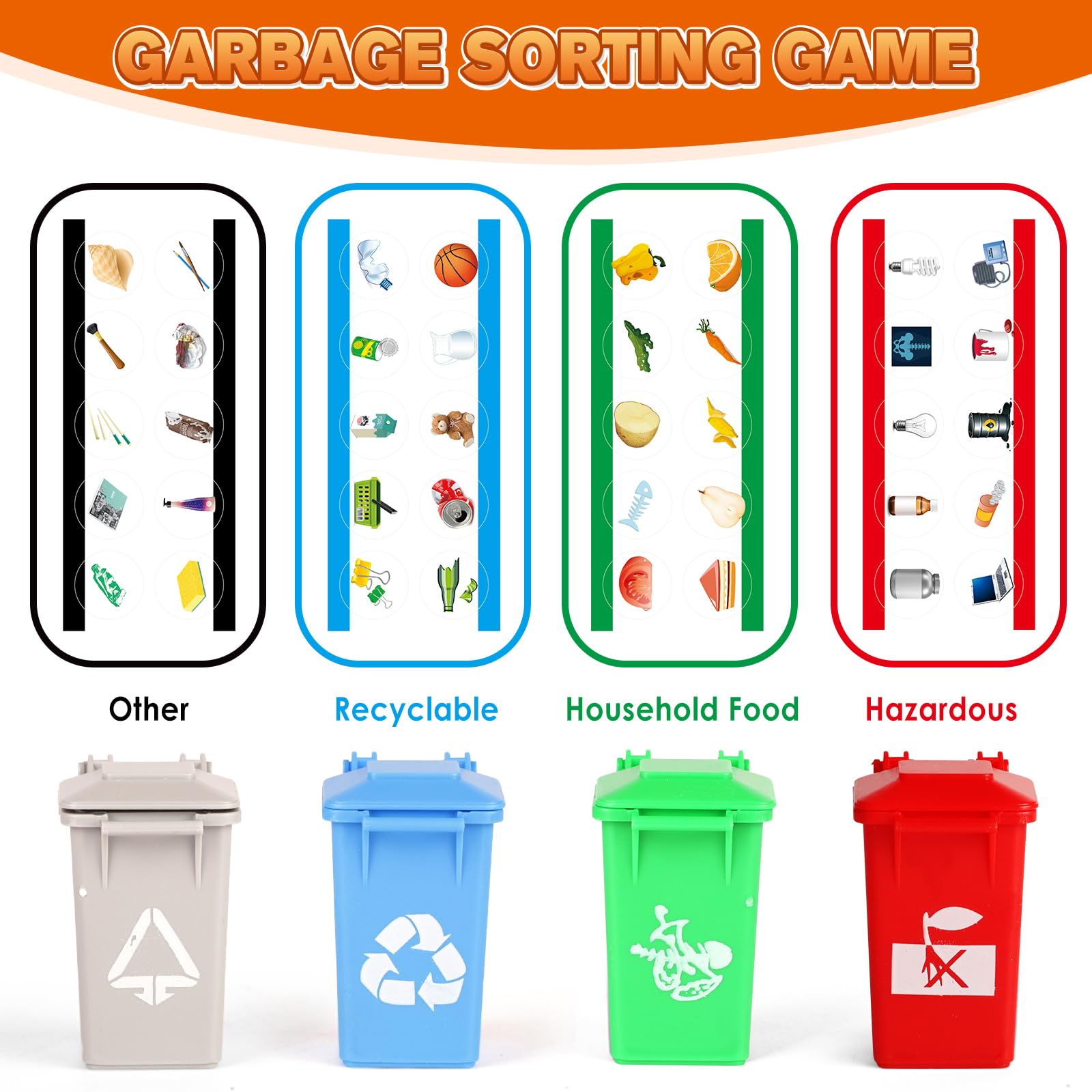 • 【SPASSIGE SORTIERAKTIVITÄT】Mit 4 verschiedenfarbigen Mülltonnen, die verschiedene Abfallkategorien darstellen, können Kinder mithilfe der illustrierten Sortierkarten lernen, wie man Gegenstände richtig sortiert – und das Lernen wird zu einem unterhaltsamen Spiel.