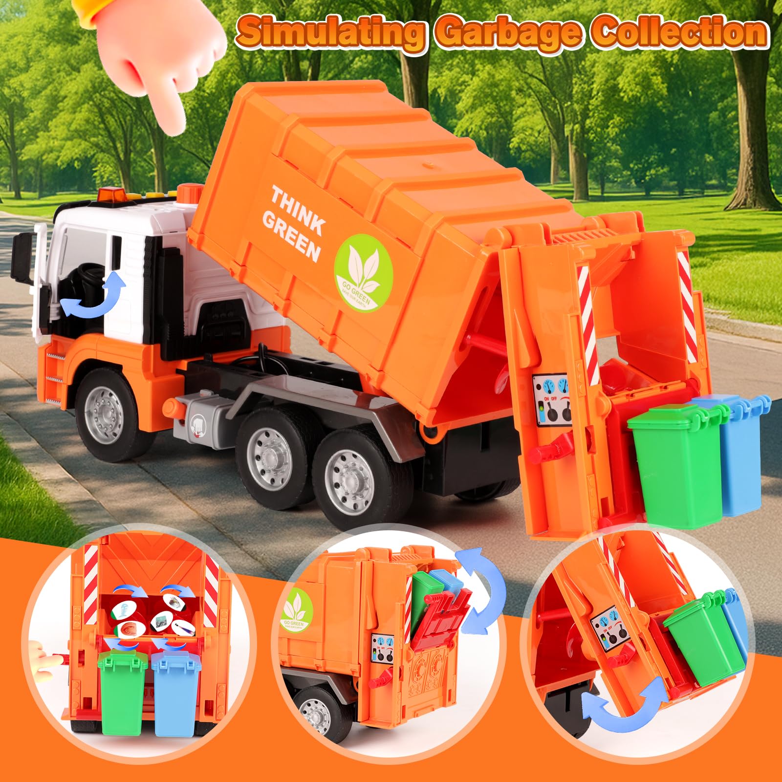 • 【SOUND UND LICHTER】Genieße ein sensorisches Erlebnis mit eingebauten Sounds und Melodien! Dieses reibungsbetriebene Spielzeugfahrzeug fährt sanft, während realistische Lichter die Spannung eines echten Müllautos in das Spiel bringen.