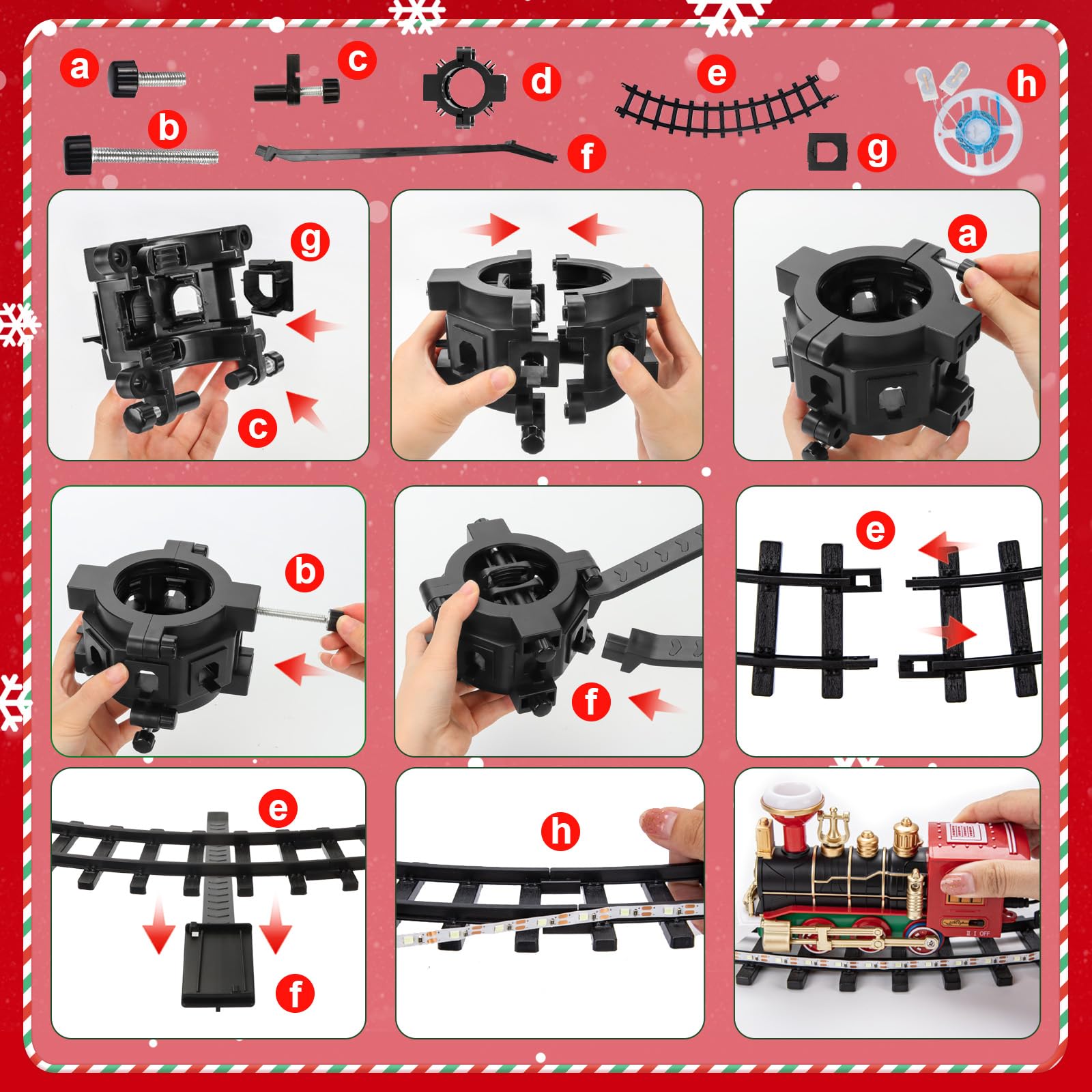 - ❗【Wichtiger Hinweis】Das Set Enthält: Kleine Züge ×4 (benötigen 4 AA-Batterien, nicht im Lieferumfang enthalten), Schienen ×8, Verbindungs-Schienen ×8, Rundverschluss Und Zubehör ×1, Sprühflasche ×1, 3-Meter-LED-Lichtband ×1 sowie Knopfbatterien Auf Dem Lichtband ×4 (Modell CR2032, bei leerer Batterie selbst austauschbar). Um sicherzustellen, dass die Baumklammer fest sitzt, wählen Sie bitte einen Weihnachtsbaum mit einem Stammdurchmesser von höchstens 6,5 cm.