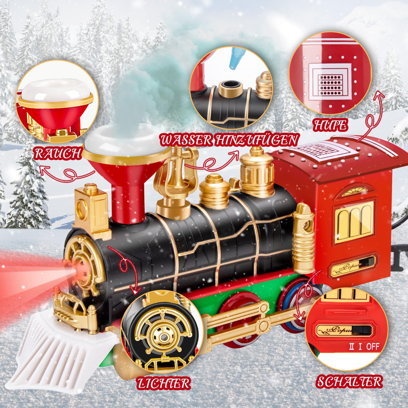 - 🎄【Neue Lichteffekte Und Dampffunktion】Der BuzzoXerex Weihnachtszug bringt dieses Jahr eine ganz neue Weihnachtsstimmung! Auf Basis der klassischen roten Waggons mit Musik und Pfeifsound haben wir den Christmas Tree Train mit einem blauen LED-Lichtband und realistischem Dampfeffekt aufgerüstet. Strahlende Lichter und aufsteigender Rauch lassen Ihren Zug Weihnachtsbaum im Handumdrehen erstrahlen und machen den Tannenbaum zum festlichen Mittelpunkt jeder Feier.