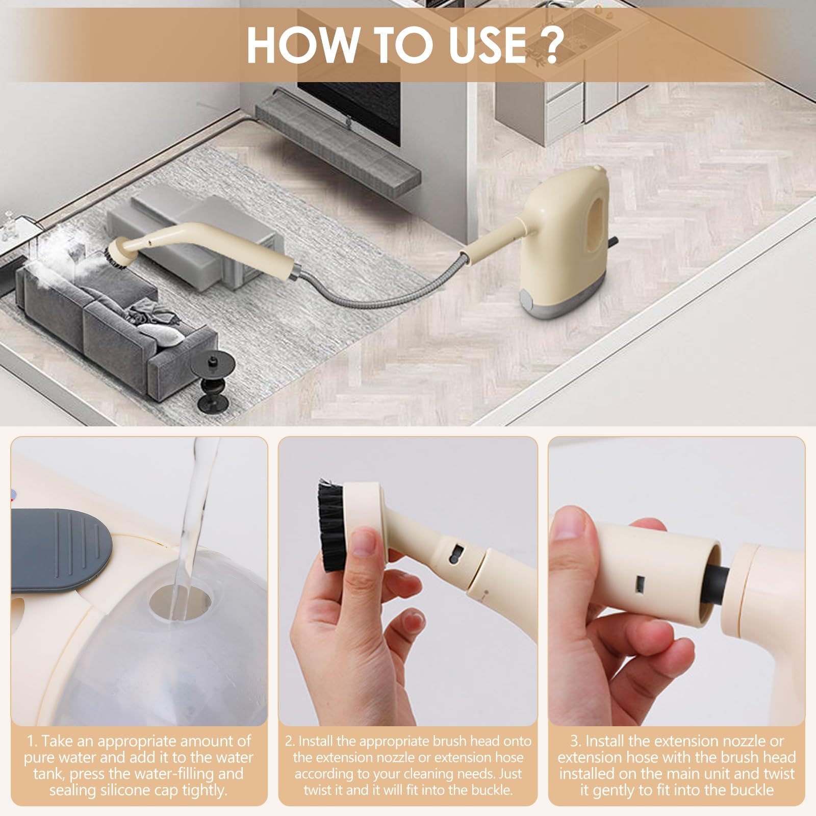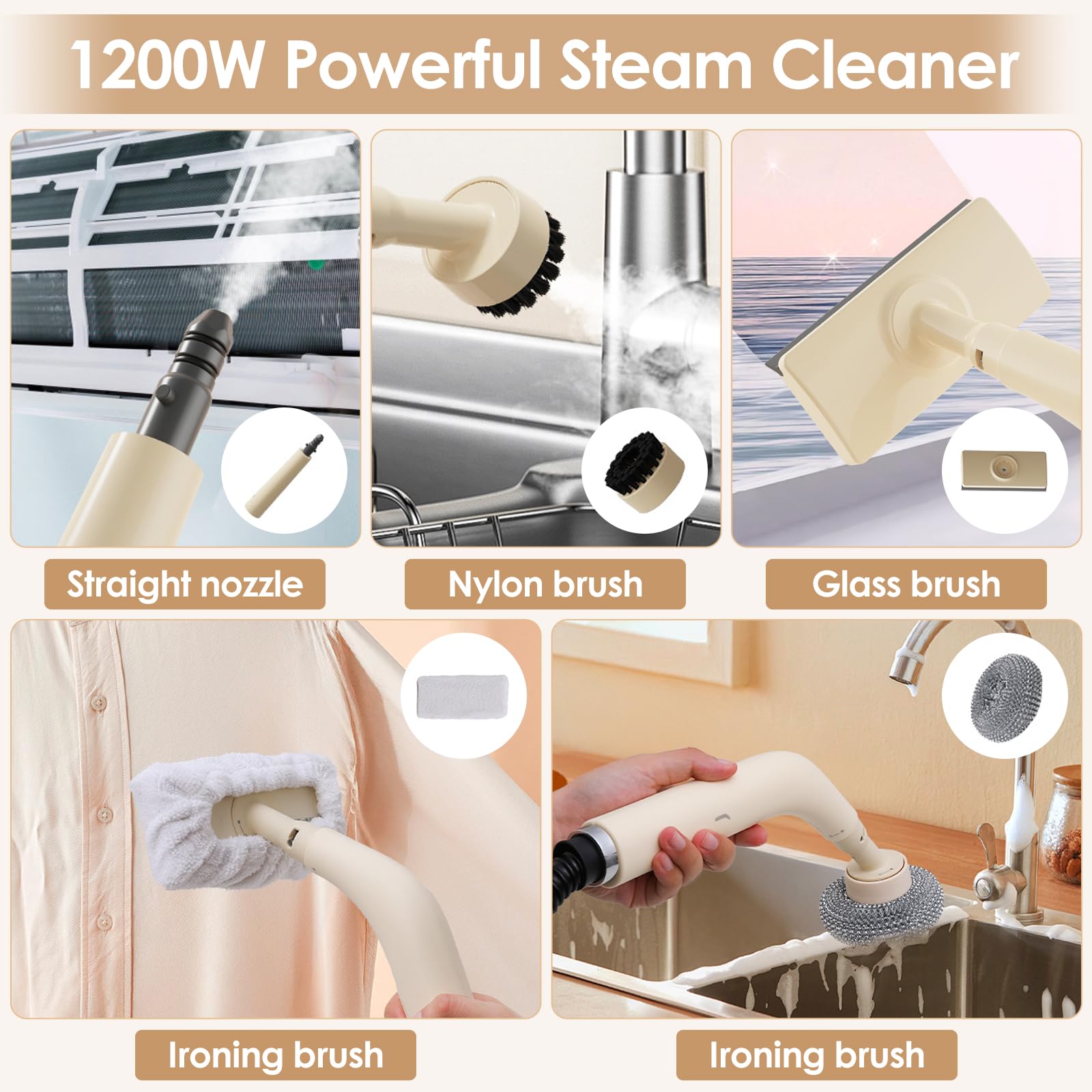 - 【Mehrzweck-Dampfreiniger】 Der Dampfreiniger enthält 8 Ersatzzubehörteile: flexible Verlängerungsdüse, Bürstenkörper, kleiner Stahlbürstenkopf, gerade Düse, Handtuchabdeckung, weicher Silikonschaber, kleiner Bürstenkopf, Stahlwolle. Sie können ihn in einer Vielzahl von Szenarien verwenden: Reinigen der Dunstabzugshaube in der Küche, Entfernen alter Flecken im Badezimmer, Glätten von Falten in der Kleidung usw.