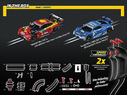 Action-Rennbahn im Maßstab 1:43 ~Originalgetreue Fahrzeuge im Maßstab 1:43 ~ Schienenelemente für actiongeladenen Fahrspaß ~ Handregler mit Turbo-Button für mehr Geschwindigkeit