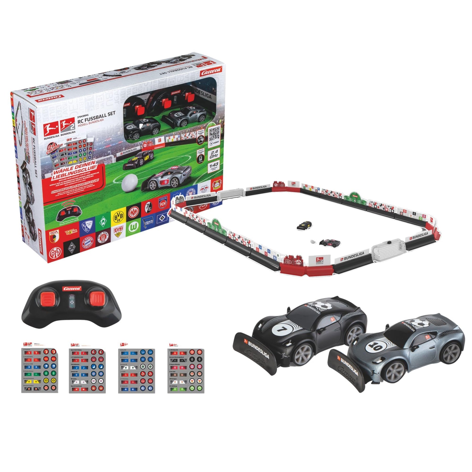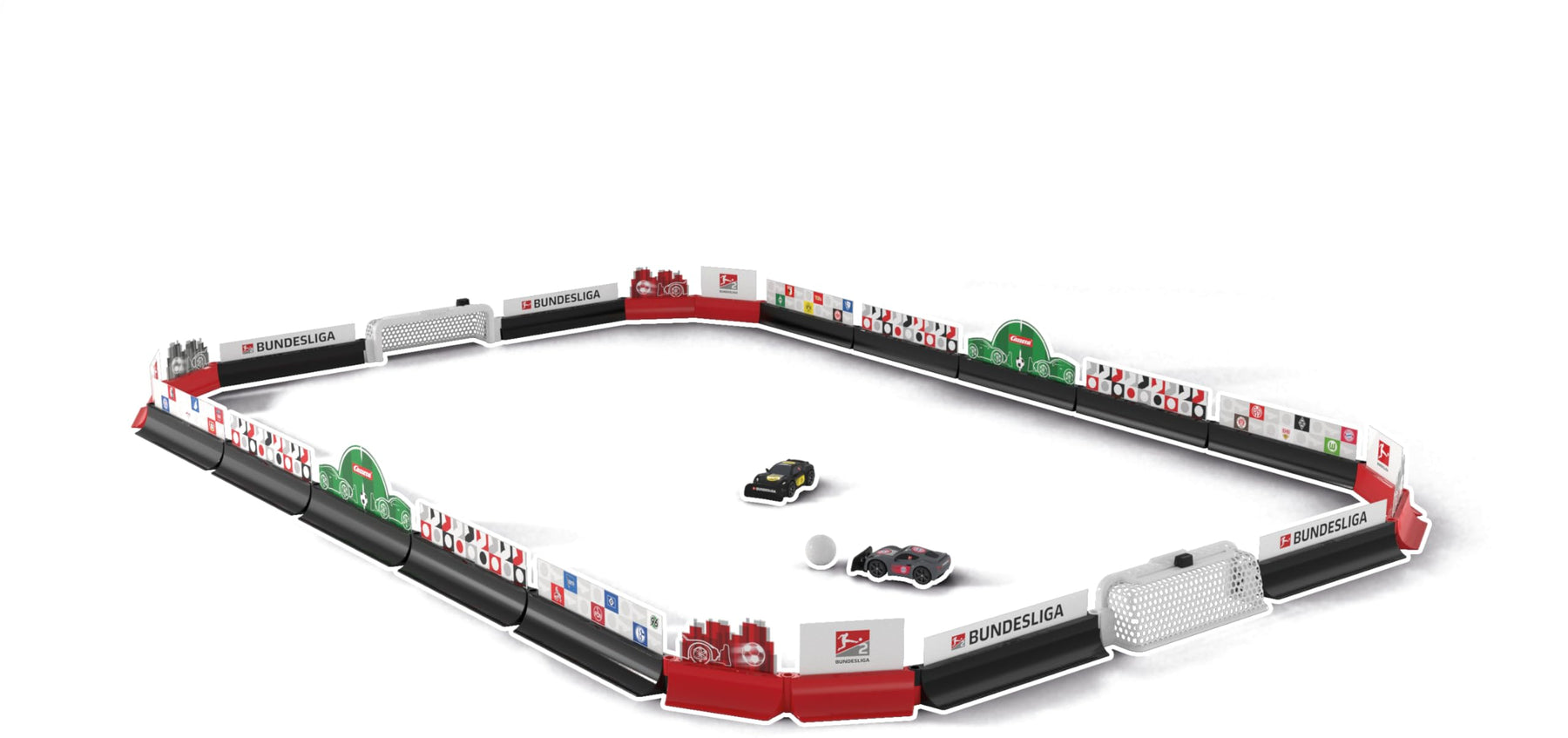 Torerfolge auf vier Rädern Mit dem Bundesliga™ RC Soccer Set wird Rennaction und Torjubel vereint - im Kinderzimmer oder auf dem Wohnzimmertisch startet das spannende Duell. Jede Menge Zubehör sorgt für authentisches Fußballfeeling wobei der Rennspaß ebenfalls nicht zu kurz kommt. Fans fühlen sich wie mitten auf dem Feld, wenn sie sich mit den 22 Bandenelementen ihr eigenes Fußballfeld bauen. Außerdem enthält das Set auch einen Ball, zwei Tore und natürlich zwei 2,4GHz Bundesliga™ Mini RC Fahrzeuge in schwarz und grau sowie Controller. Die beiden Fahrzeuge können dank Original-Bundesliga-Lizenz mit Stickern von 24 Clubs dekoriert werden, so dass direkt klar wird, für welchen Verein das Herz der jungen Fans schlägt. Mit der Profi- oder Beginnerschaufel gilt es nun, den Ball geschickt ins Tor zu bugsieren - und sich die Spitze der Fußball-Tabelle zu sichern!
