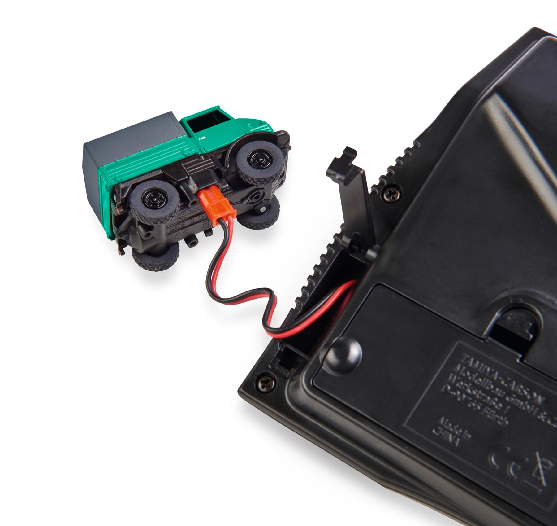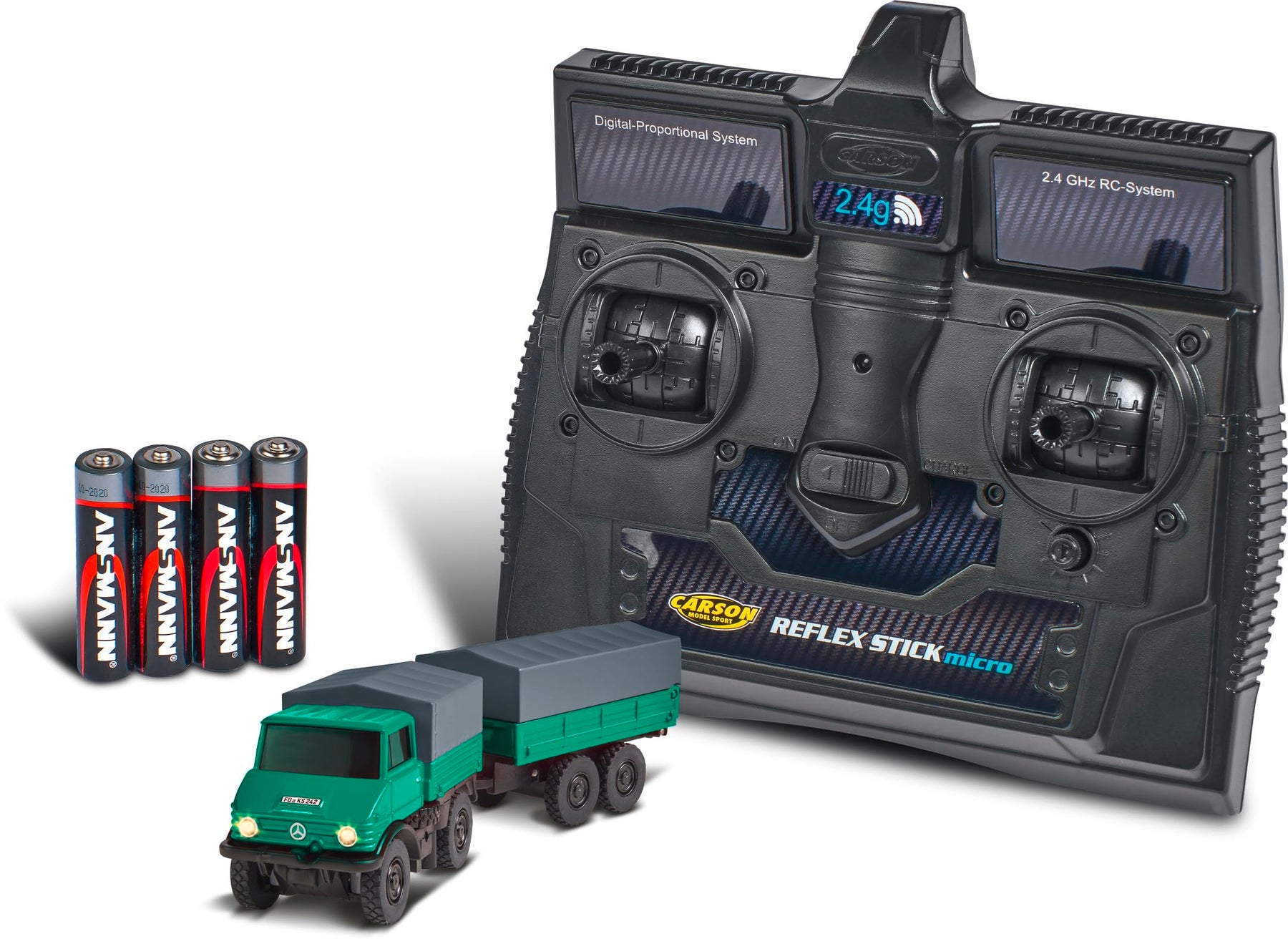 Der neue MB Unimog U406 Forst mit Anhänger von CARSON im Maßstab 1:87 begeistert als absolutes High-Tech-Fahrzeug und bietet sogar eine aufregende Zusatzfunktion. Mit einer störungsfreien 2,4 GHz Fernsteueranlage wird eine präzise Steuerung von Gas und Lenkung ermöglicht. Der Li-Ion Fahrakku ermöglicht bis zu 60 Minuten reiner Fahrzeit bei einer kurzen Ladezeit von nur 45 Minuten. Der Unimog U406 verfügt zusätzlich über ein zuschaltbares Signallicht und eine sehr detaillierte Lackierung. Die technisch designte Fernsteuerung "Reflex Stick Micro" bildet das Bindeglied zwischen Nostalgie und Moderne. Fahrzeug und Sender können in der im Set enthaltenen Vitrine aufbewahrt werden. Mit dem anzubringenden Schlitten bietet sich die einzigartige Funktion, das Fahrzeug auch auf Schienen Spurbreite H0 zu fahren. Das nostalgische Design und die moderne Technologie in Kombination garantieren stundenlangen Spielspaß für Modellbaufans jeden Alters.