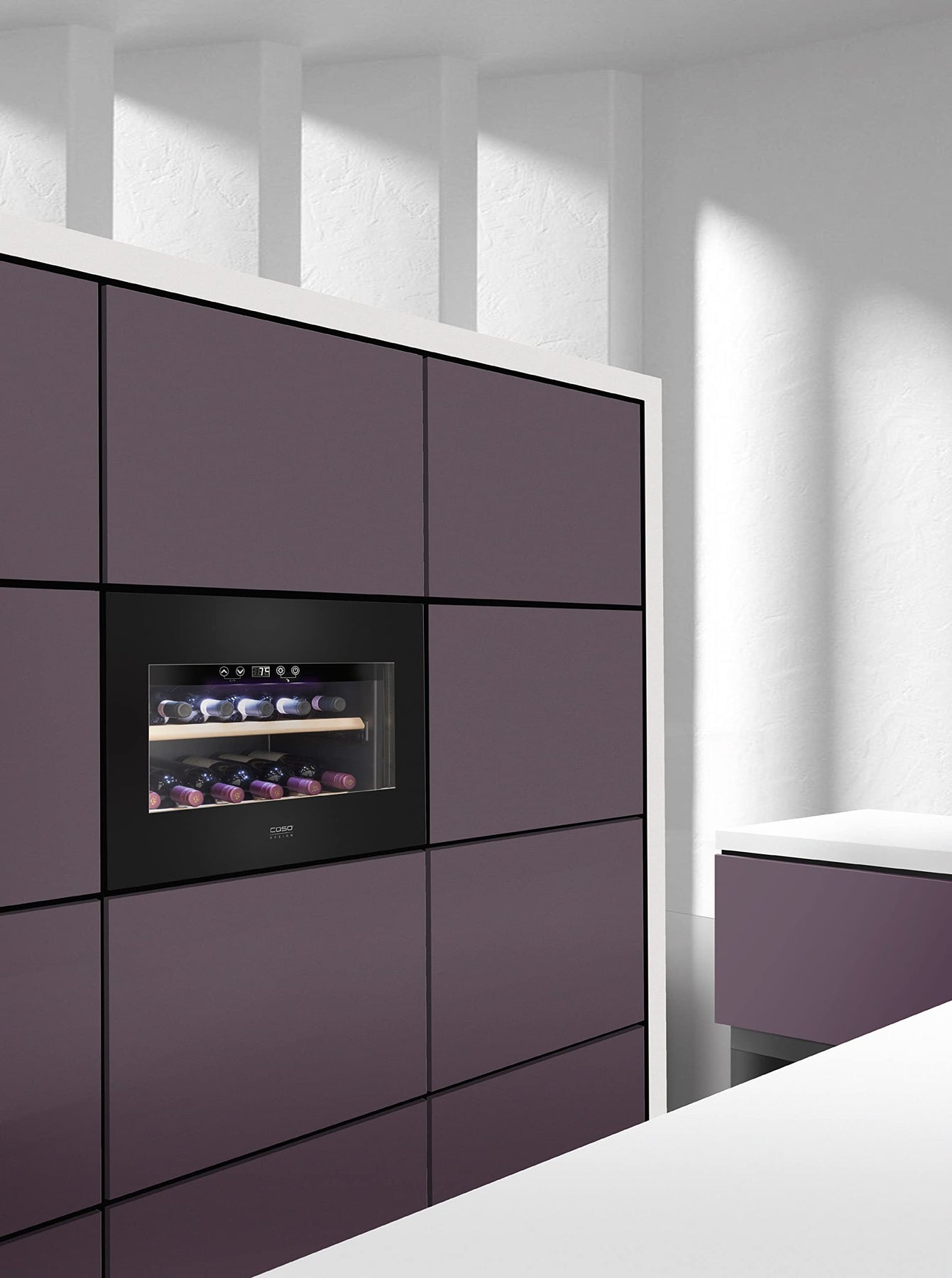 Einzelheiten: Caso WineDeluxe E 18 - Design Einbau- Weinkühlschrank mit Kompressortechnik / Einbau-Weinkühlschrank für die Lagerung von bis zu 18 Flaschen (bis zu 310 mm Höhe) / Für jede 45er Nischenhöhe / Eine Temperaturzone elektronisch einstellbar von 5 - 20 °C (41 - 68 °F) / Push-to-open Türsteuerung / Soft-close Hettich Scharniere / Laufruhiger Kompressor sorgt für eine schonende und ruhige Weinlagerung / Aktive Lüftung für eine gleichmäßige Temperaturverteilung / 3-lagiges Isolierglas mit UV-Filter für optimalen Aromaschutz / Sensor-Touch Steuerung / LED Temperaturanzeige der Kühlzone / Zuschaltbare, weiße Innenraumbeleuchtung / Zwei kugelgelagerte, herausnehmbare Holzlagerböden / Türanschlag wechselbar