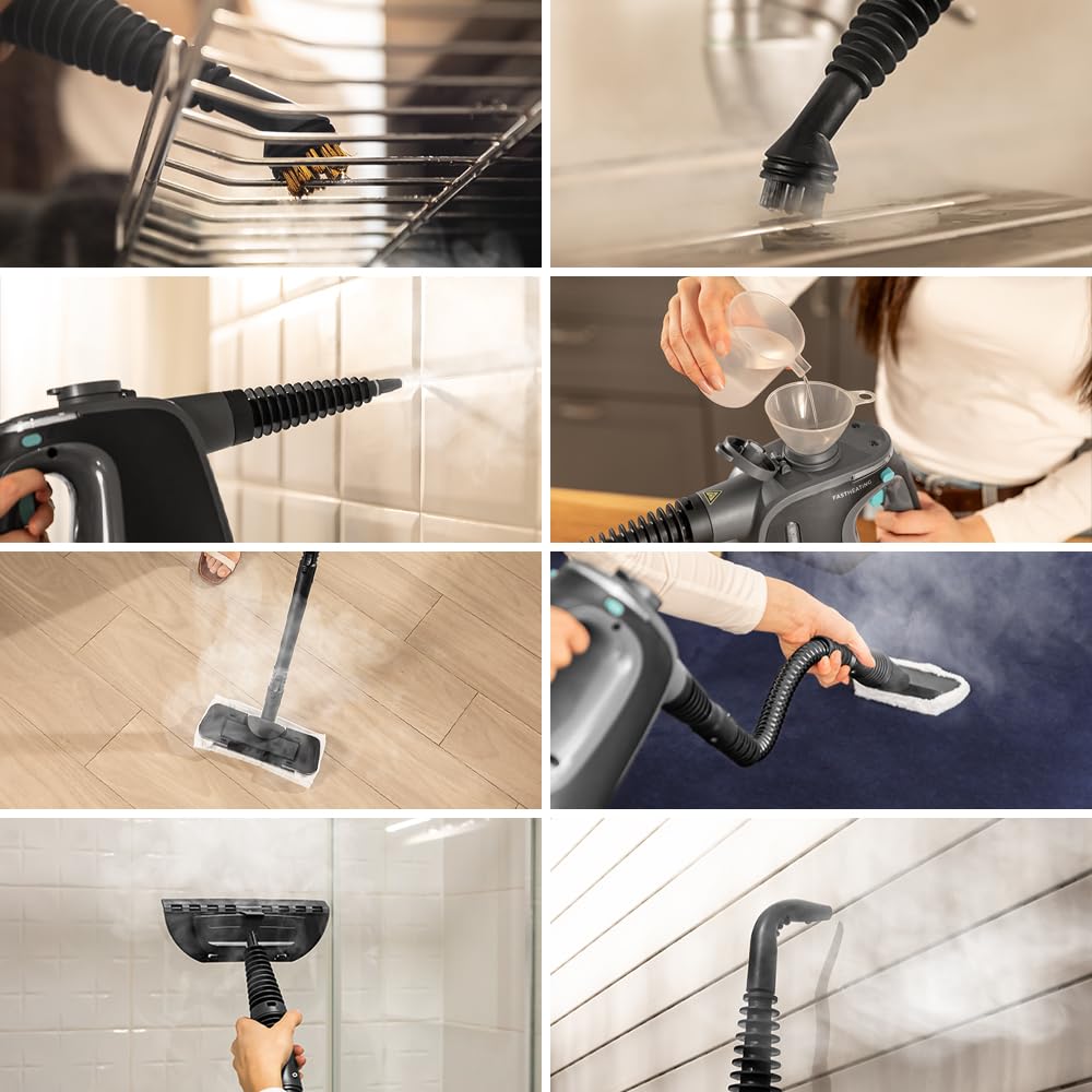 - Handdampfreiniger mit schneller Aufheizung und maximaler Leistung von 1350 W. Reinigt und desinfiziert für perfekte Ergebnisse. 550 ml Wassertank. 3 Bar Druck und 32 g/min Dampfmenge. Kontinuierliche Dampfsperre. Set mit 16 Zubehörteilen, reinigt jede Oberfläche: Küche, Bad, Fenster, Textilien, Fliesen.