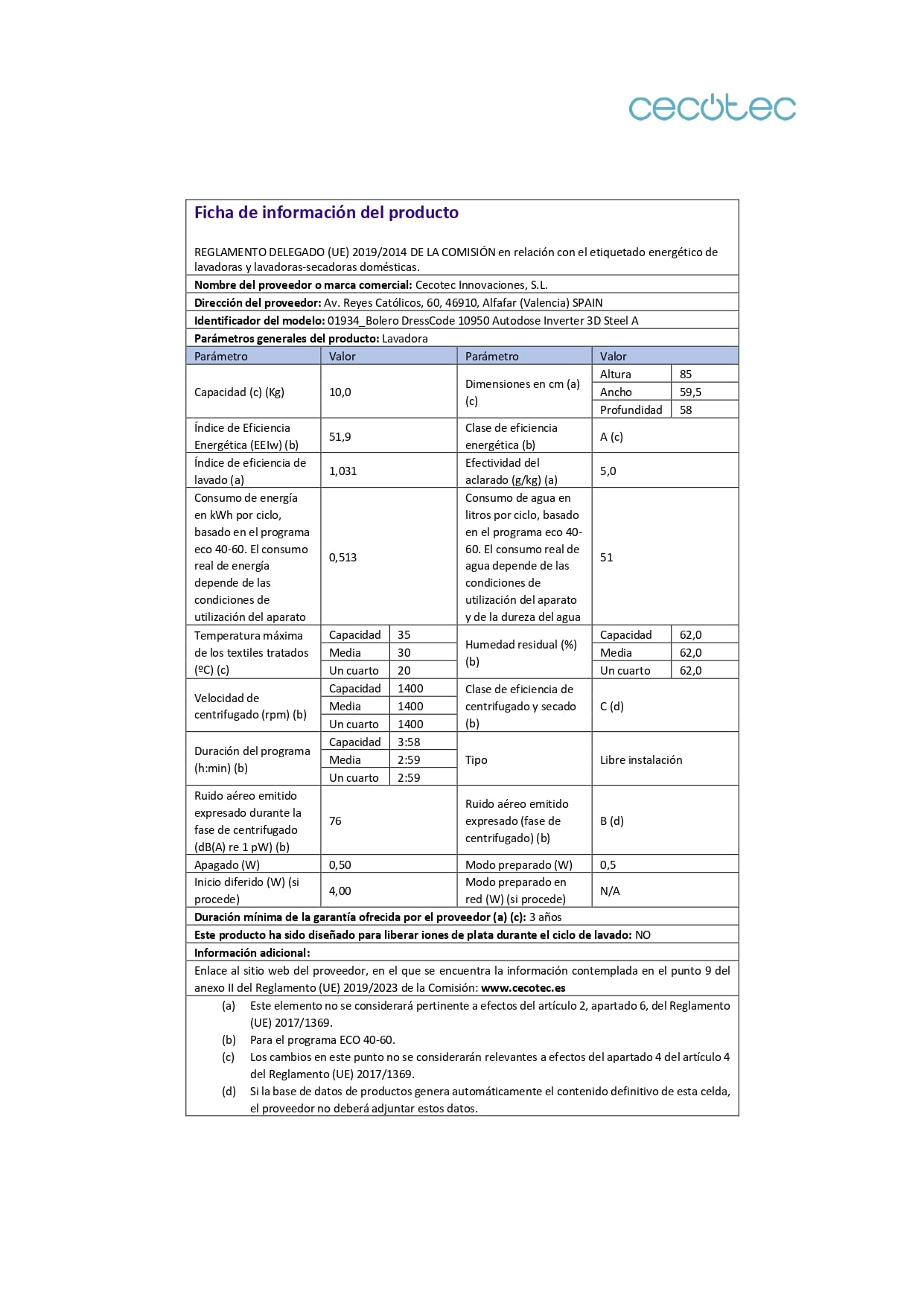 Einzelheiten: Cecotec Waschmaschine 10 kg Frontlader Bolero Dresscode 10950 Autodose Inverter 3D Steel A. 10 kg, 1400 U/min, Matrix-Display 9,2", 16 Programme, niedriger Verbrauch, Inverter Plus Motor, Auto-Dosierung, Steammax