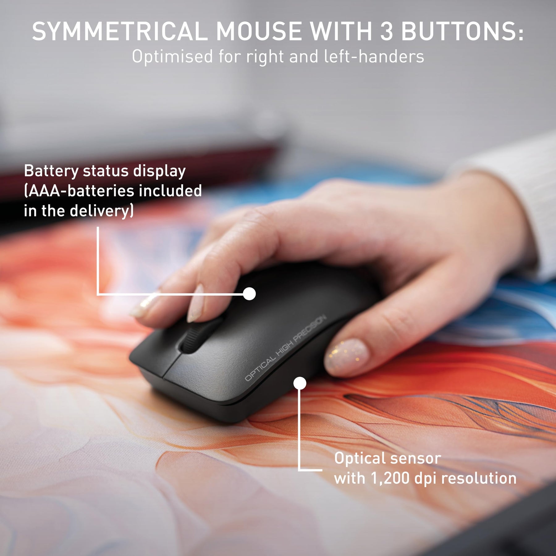 Einzelheiten: Hochwertige deutsche Ingenieurskunst trifft auf herausragendes Design - das ist CHERRY. Bereits 1953 begann die Fertigung der ersten Mikroschalter im Keller eines Restaurants in Illinois. 20 Jahre später wurden die ersten Keyboards gebaut - somit ist CHERRY der älteste Hersteller von Computertastaturen. 1983 startete die Produktion der MX-Switches, die mittlerweile milliardenfach in Millionen Tastaturen rund um den Globus zum Einsatz kommen. Jahrzehntelange Erfahrung, Leidenschaft und Tradition machen die Marke mit der Kirsche zu dem, wofür sie heute steht: Qualitätsprodukte, die in Deutschland entworfen werden und sich an all diejenigen richten, die einen hohen Anspruch an Leistung, Design, Lebensdauer und Funktionalität ihrer Eingabegeräte haben. Das kabellose Desktop-Set CHERRY DW 3000 ist grundsolide CHERRY-Technologie mit einem hervorragenden Preis-Leistungs-Verhältnis. Die flache Tastatur mit kurzhubigen Softkeys, einem sanften, leisen Tastenanschlag sowie einer dauerhaft abriebfesten Beschriftung ermöglicht präzises, schnelles Schreiben bei minimaler Geräuschentwicklung. Die optische 3-Tasten-Maus ist auf die Tastatur abgestimmt und gleitet eindrucksvoll über die meisten Oberflächen. Das Set punktet mit seiner langen Batterielaufzeit. Die Maus schaltet sich bei Nichtgebrauch automatisch in den Sleep-Modus, sollte beim Transport jedoch ausgeschaltet werden. Die leichte Tastatur und Maus machen das Set zum perfekten Begleiter für mobiles und flexibles Arbeiten.