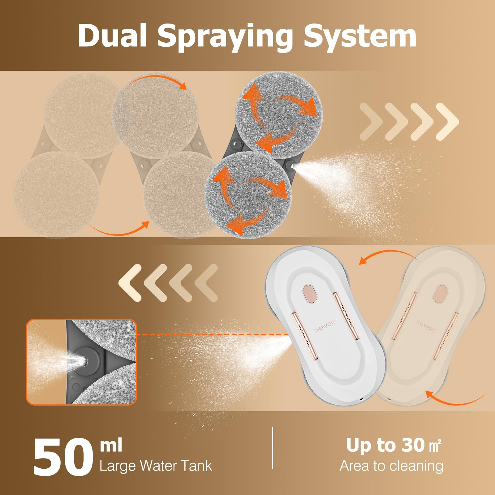 - Reinigen Sie das Fenster perfekt-1. Sie können zuerst die automatische Sprühtaste auf der Fernbedienung ausschalten und den Roboter veranlassen, das Fenster mit einem trockenen Faserpad zu reinigen, um Staub zu entfernen. 2. Ersetzen Sie das saubere Faserpad und schalten Sie die automatische Taste ein die Fernbedienung. Dann hinterlässt die hochwertige Ökofasermatte keine Spuren auf der Glasoberfläche.
