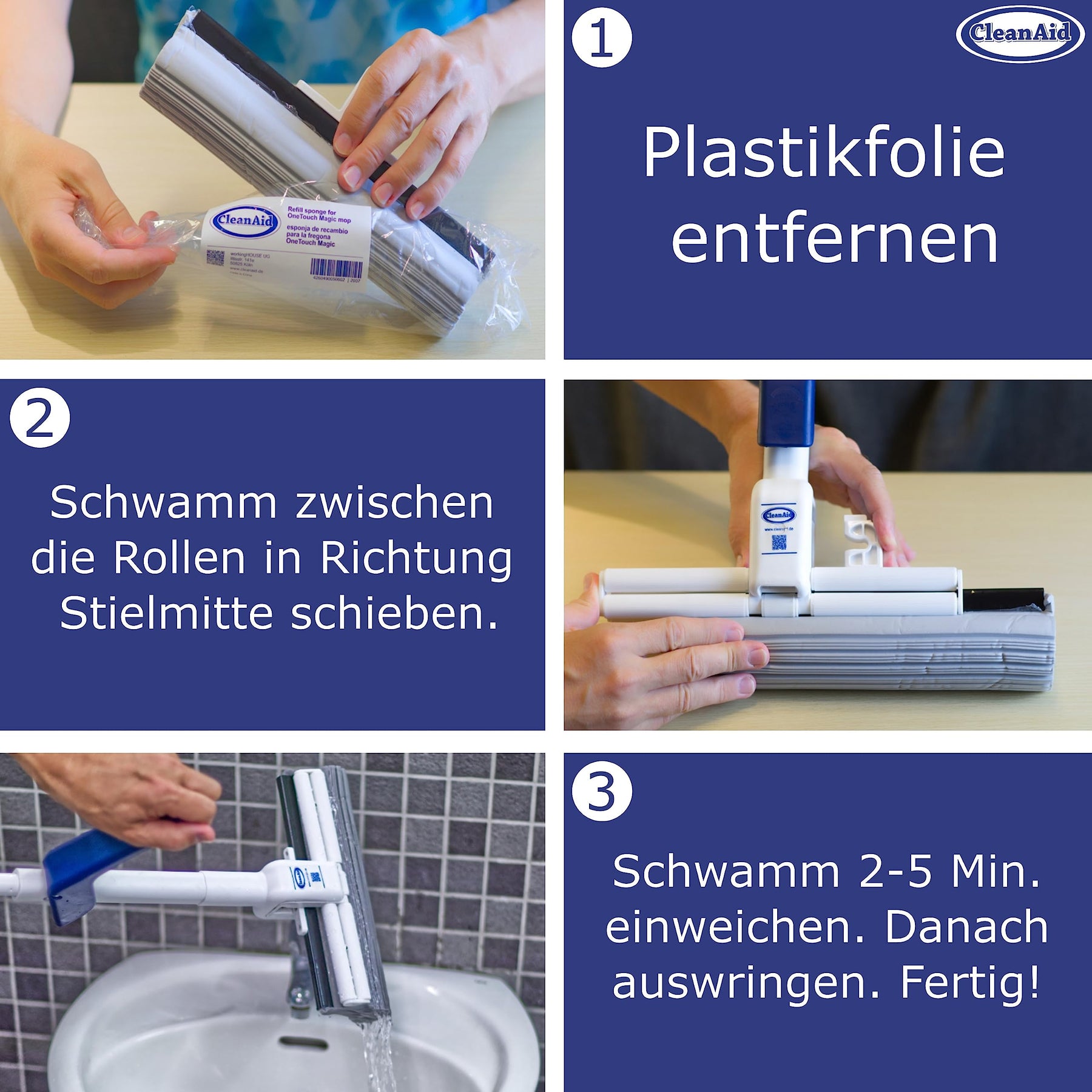 - Achtung: Vor jeder Benutzung und jedem Schwammwechel muss der Schwamm gut eingeweicht und weich sein. AUSGEZEICHNETE BODENREINIGUNG - Der OneTouch Magic Wischmopp von der Marke CleanAid liefert bei jeder Anwendung ein hervorragendes Reinigungsergebnis. Der super saugfähige PVA-Schwamm saugt überschüssiges Wasser auf und hinterlässt den Boden fleckenlos, trocken und sauber. Die Entfernung von Tierhaaren ist ebenfalls problemlos möglich.