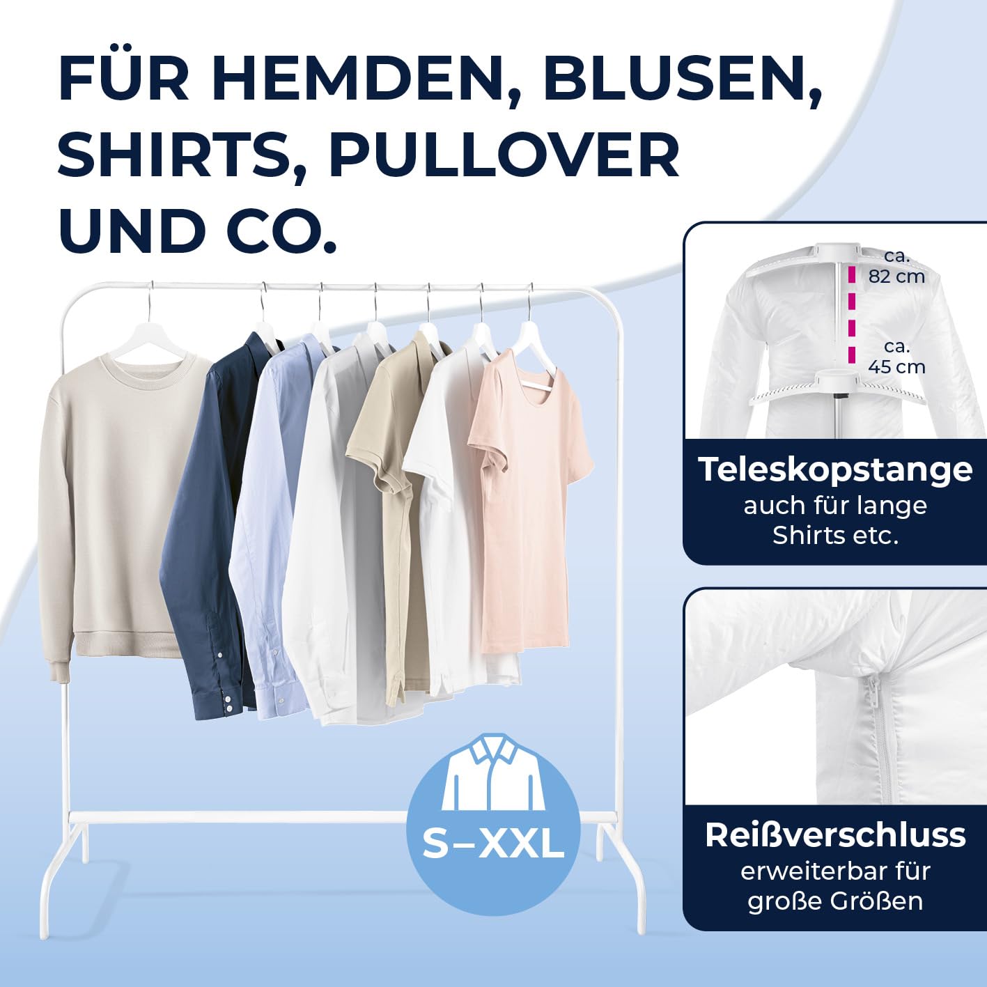 - 'SMARTE FEATURES: Der Hemdenbügler kann dank Reißverschluss-Erweiterung für fast alle Größen genutzt werden – von S bis XXL. Und sogar lange Kleidungsstücke kannst du mit dem Bügelautomaten trocknen & glätten. Passe einfach die ausziehbare Teleskopstange an die Länge deines Tops oder deiner Bluse an.