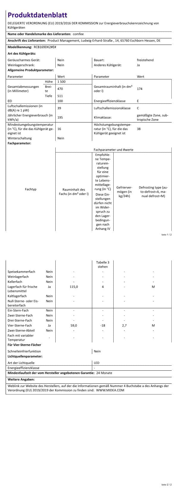 Einzelheiten: Comfee RCB169DK2(E) Kühl-/Gefrierkombination/150 cm Höhe/Low Frost/195 kWh/Jahr/115L Kühlteil/59L Gefrierteil
