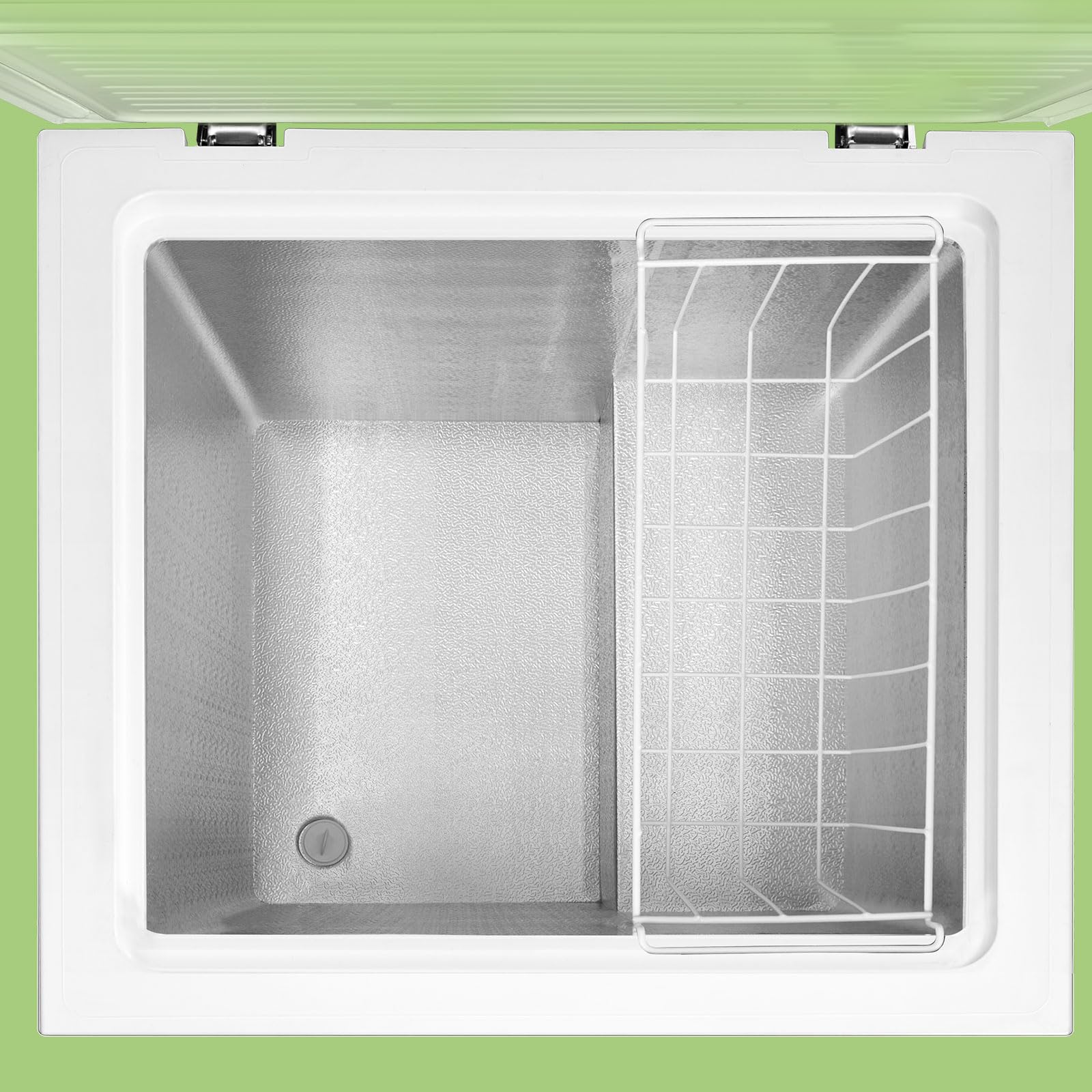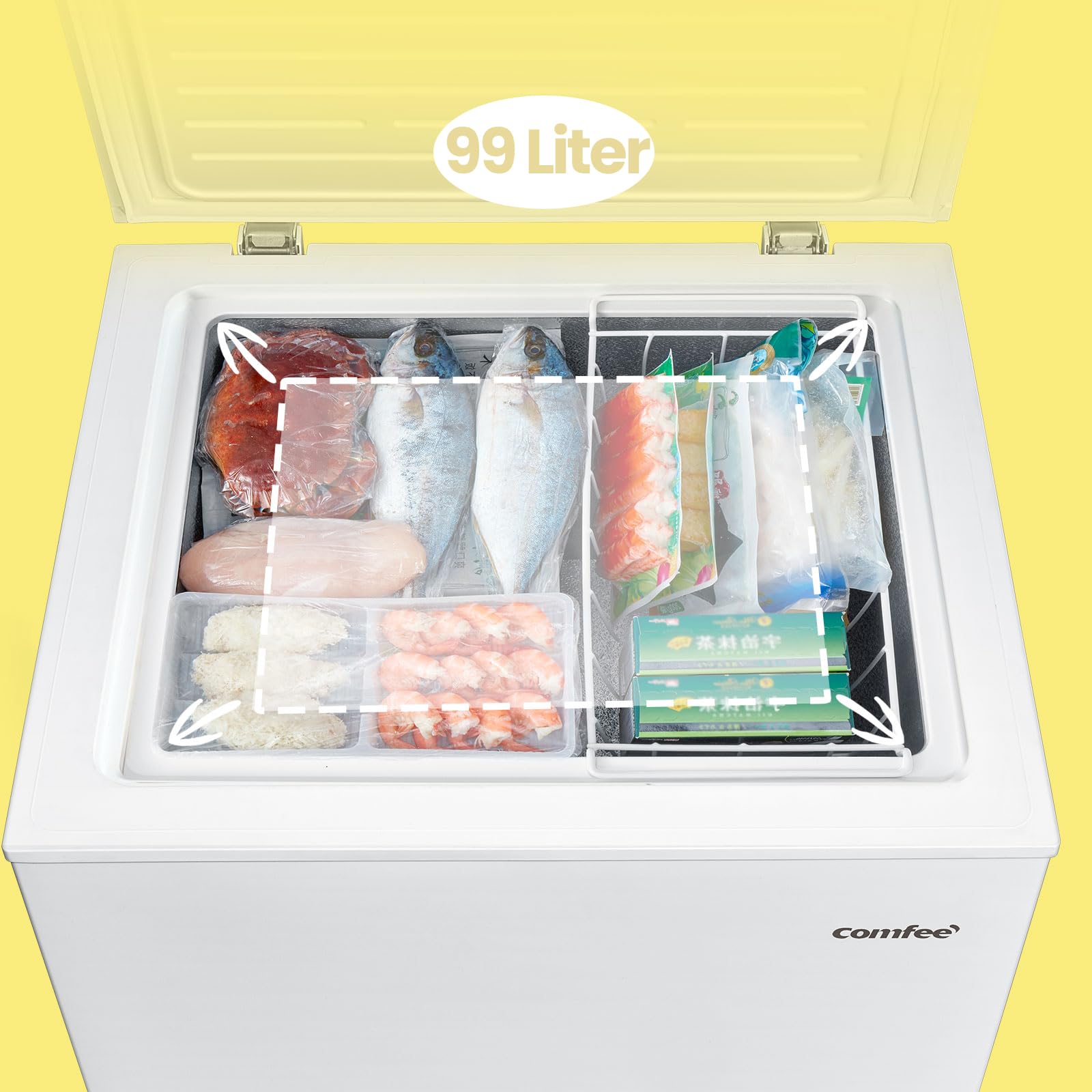 Einzelheiten: Comfee RCC100WH2(E) Gefriertruhe / 169 kWh/Jahr / 85cm hoch / 99L / Einstellbarer Temperaturregler / Hängekorb innen / Semi Circle Gefrierrohre / Weiß