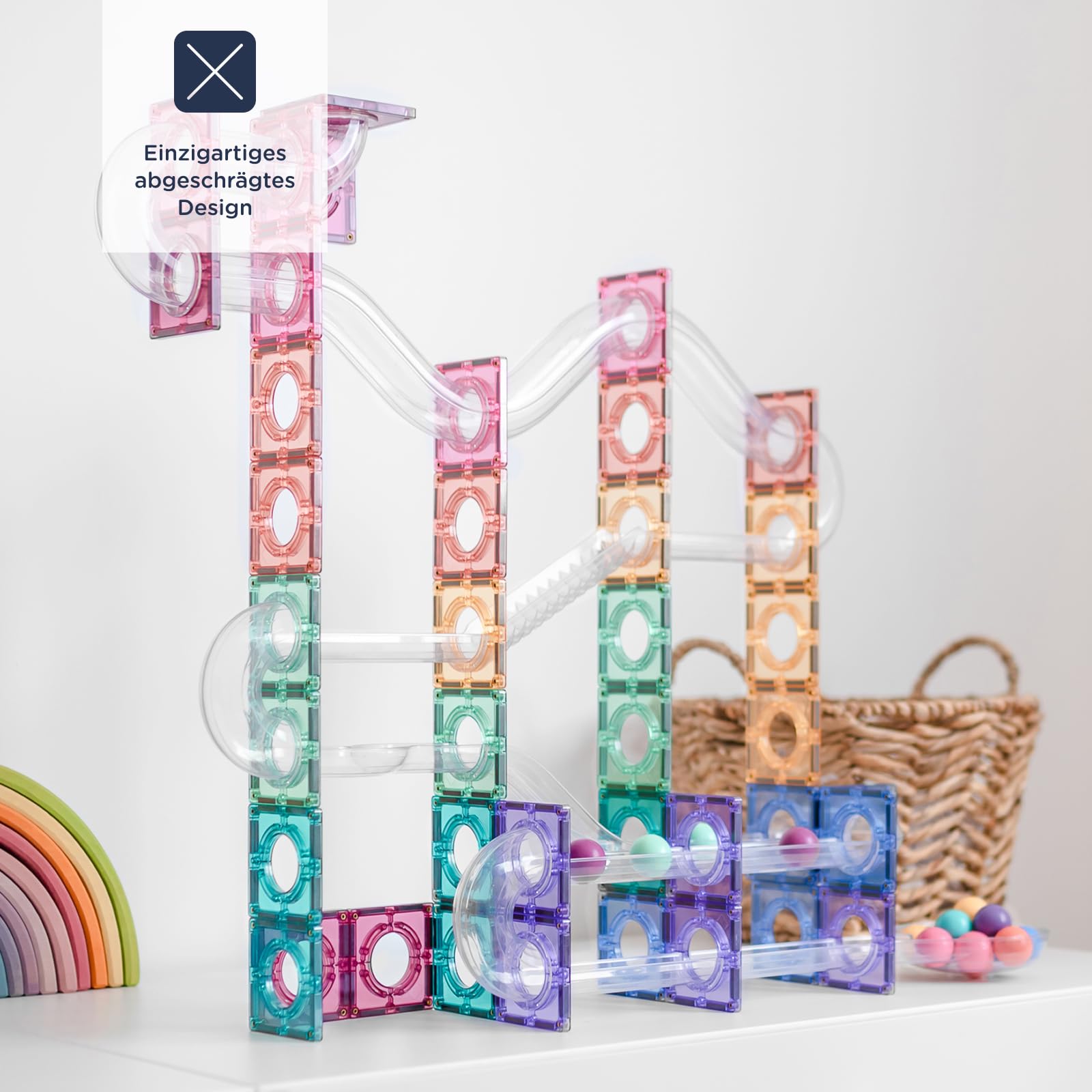 - 106 STÜCK PACK - Enthält 48 x Verbindungsquadrate, 2 x Y-förmige geteilte Rohre, 2 x lange Treppen, 2 x S-förmige gebogene Rohre, 8 x U-förmige Rohre, 8 x Schieberohre, 12 x rechtwinklige Rohre, 6 x lange gerade Rohre, 8 x kurze gerade Rohre, 2 x Schalen und 8 x Holzkugeln in erdigen Pastellfarben und klaren geriffelten Rohren.