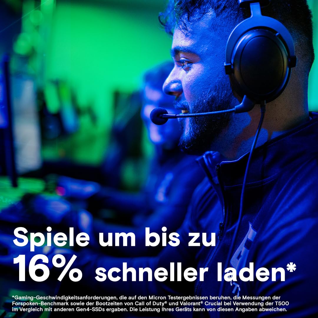 Verbessern Sie Ihre Systemleistung mit der Crucial T500 Gen4 NVMe SSD. Beschleunigen Sie Ihr Gaming-Erlebnis und entfalten Sie Ihr kreatives Potenzial mit einer SSD, die so schnell ist, wie Sie es sich wünschen. Selbst anspruchsvolle Aufgaben stellen dank der besseren Energie-Leistungseffizienz kein Problem dar. Die T500 ist kompatibel mit Ihrem Laptop oder Desktop-Computer. Verbessern Sie Ihre Systemleistung mit der Crucial T500 Gen4 NVMe SSD. Spiele um bis zu 16% schneller laden mit sequenziellen Lese- und Schreibgeschwindigkeiten bis zu 7.400MB/s und 7.000 MB/s (bis zu 1,18M/1,44M IOPS zufälliges Lesen/Schreiben). Perfekt für die PS5. Die T500 sorgt für mehr Geschwindigkeit bei Gaming, Videobearbeitung und 3D-Rendering. Einfach zu installieren und bis zu 4TB Speicherkapazität. Die T500 bietet genügend Platz für all Ihre Spiele oder Projekte. Mit fortschrittlichem TLC NAND-Speicher, einem bis zu 40% höheren Energie-Leistungsverhältnis und mit der doppelten Geschwindigkeit von Gen3, optimiert die T500 Ihre Systemleistung – für schnelleres Arbeiten bei geringerem Stromverbrauch. Optimiert für Microsoft DirectStorage unterstützt die T500 außerdem ein schnelleres Rendering und eine geringere CPU-Auslastung, für ein intensiveres Gaming-Erlebnis.