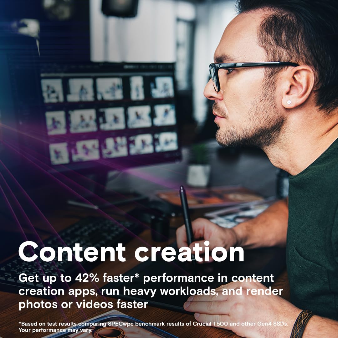 Verbessern Sie Ihre Systemleistung mit der Crucial T500 Gen4 NVMe SSD. Spiele um bis zu 16% schneller laden mit sequenziellen Lese- und Schreibgeschwindigkeiten bis zu 7.400 MB/s und 7.000 MB/s (bis zu 1,18M/1,44M IOPS zufälliges Lesen/Schreiben). Die T500 sorgt für mehr Tempo bei Gaming, Videobearbeitung und 3D-Rendering. Einfache Installation und einsatzbereit für Laptop, Desktop-Computer oder Motherboard. Die T500 sorgt mit bis zu 4 TB Speicher für mehr Tempo bei Gaming, Videobearbeitung und 3DRendering. Mit fortschrittlichem TLC NAND-Speicher, einem bis zu 40% höheren Energie-Leistungs-Verhältnis und der doppelten Geschwindigkeit von Gen3, optimiert die T500 Ihre Systemleistung – für schnelleres Arbeiten bei geringerem Stromverbrauch. Optimiert für Microsoft DirectStorage unterstützt die T500 außerdem ein schnelleres Rendering und eine geringere CPU-Auslastung, für ein intensiveres Gaming-Erlebnis.