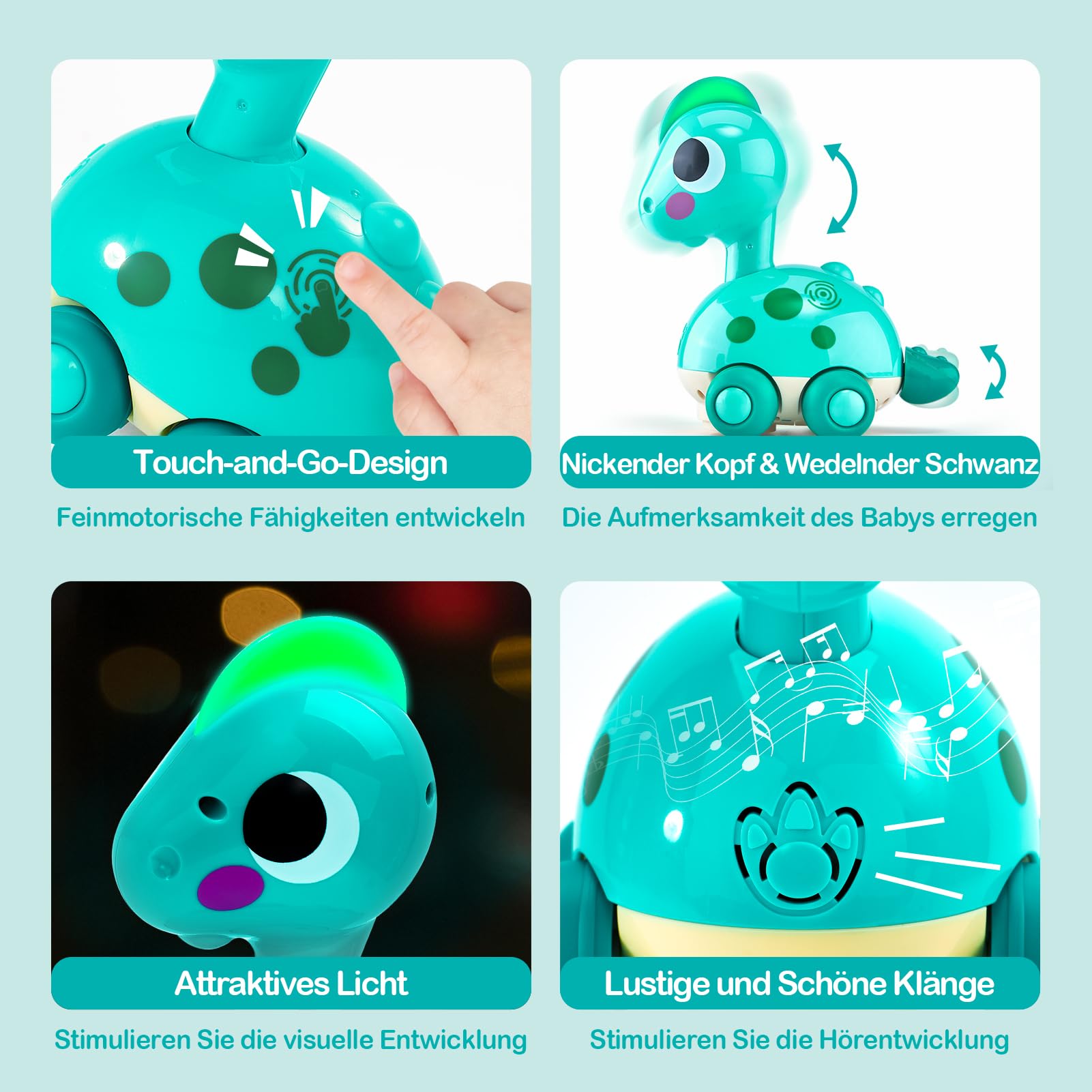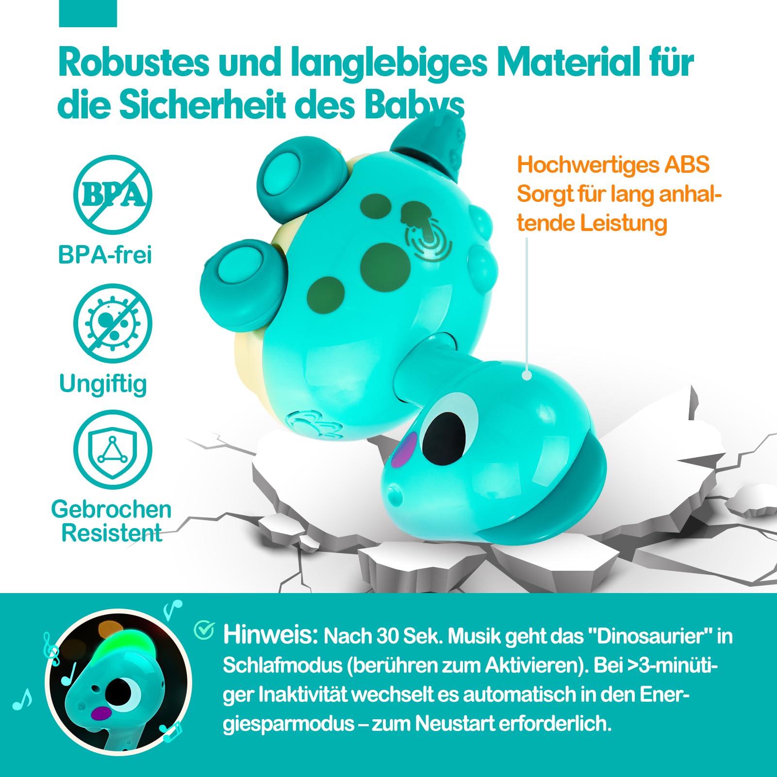 - 🦖【Dinosaurier Musik Baby Spielzeug】Dies ist ein lustiges interaktives Krabbelspielzeug für baby. Es hat eine niedliche Dinosaurierform, die sich bewegen und nicken kann, sowie LED-Lichter und Soundeffekte, um Babys zum Jagen und Krabbeln anzulocken. Es ist ideal für Baby spielzeug 6 Monate, um beim Spielen körperliche motorische Fähigkeiten zu entwickeln und zu lernen, den Kopf zu heben, aufrecht zu sitzen, zu rollen und zu krabbeln usw.