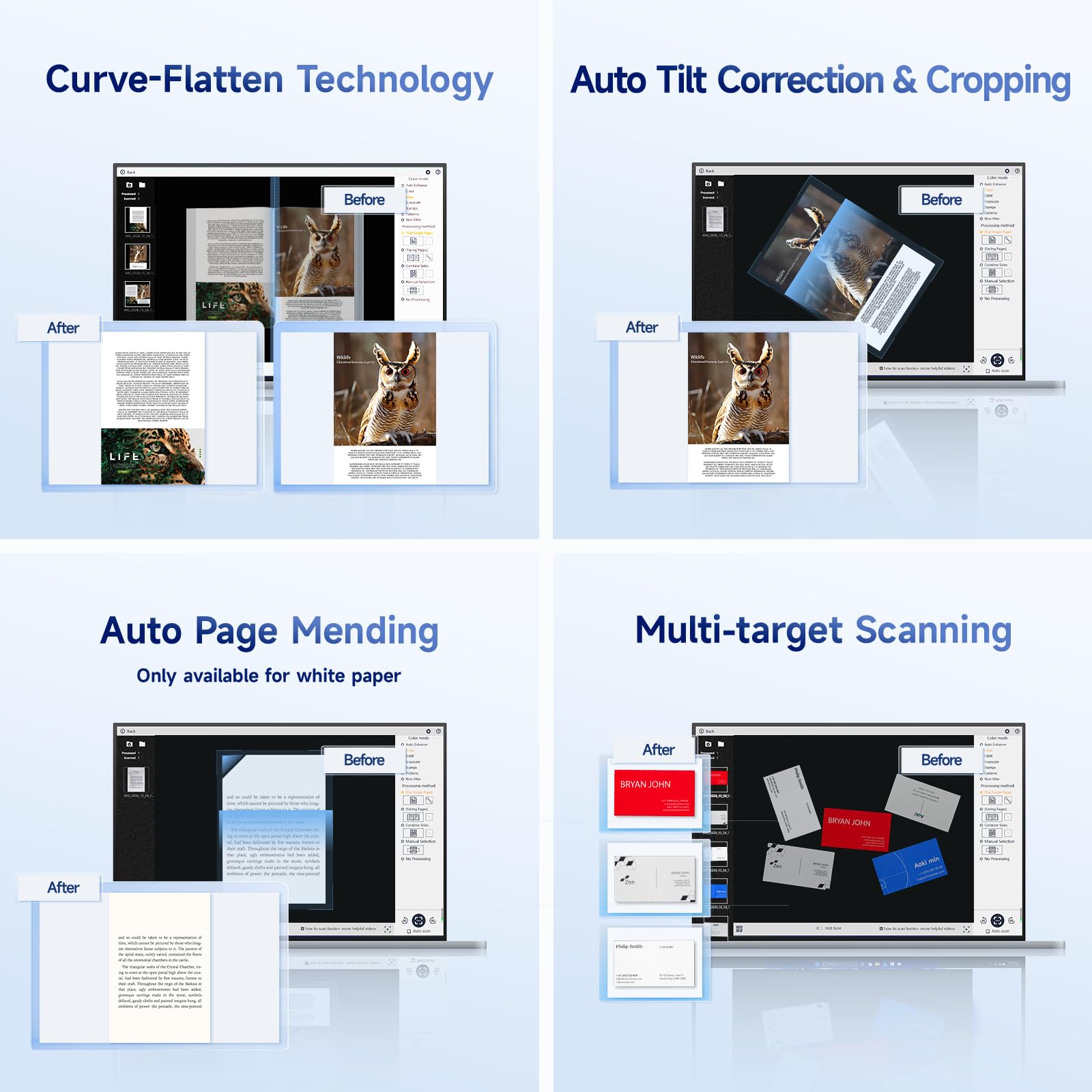 - Vielfältige Dokumente Scannbar: Dank der initiativen Bildabflachungstechnologie von CZUR brauchen Sie nicht mehr die Buchbinden während des Scannens zu beschädigen/zerlegen. Mithilfe drei Laserstrahlen werden gewölbte Buchseiten intelligent simuliert, dabei werden den Buchseiten durch AI-Technologie abgeflacht. CZUR Aura Pro Scanner kann nicht nur flache Dokumente, sondern auch gewölbte Bücher, Verträge, Gemälde, Formulare, Rechnungen, Visitenkarten usw. Dokumente kleiner als A3 Größe scannen