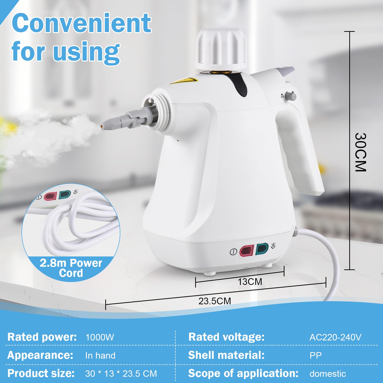 • 【Benutzerfreundlich】Schalten Sie die Stromversorgung ein, der Dampfreiniger beginnt sofort mit dem Heizvorgang. Dampfreiniger verfügt über einen großen Wassertank mit einer Kapazität von 350ml (empfohlene Ladekapazität liegt innerhalb von 280ml). Mit dem leichten Gehäuse, dem extralangen Netzkabel und dem mitgelieferten kompletten Reinigungszubehör kann der tragbare Dampfreiniger frei und breit eingesetzt werden.