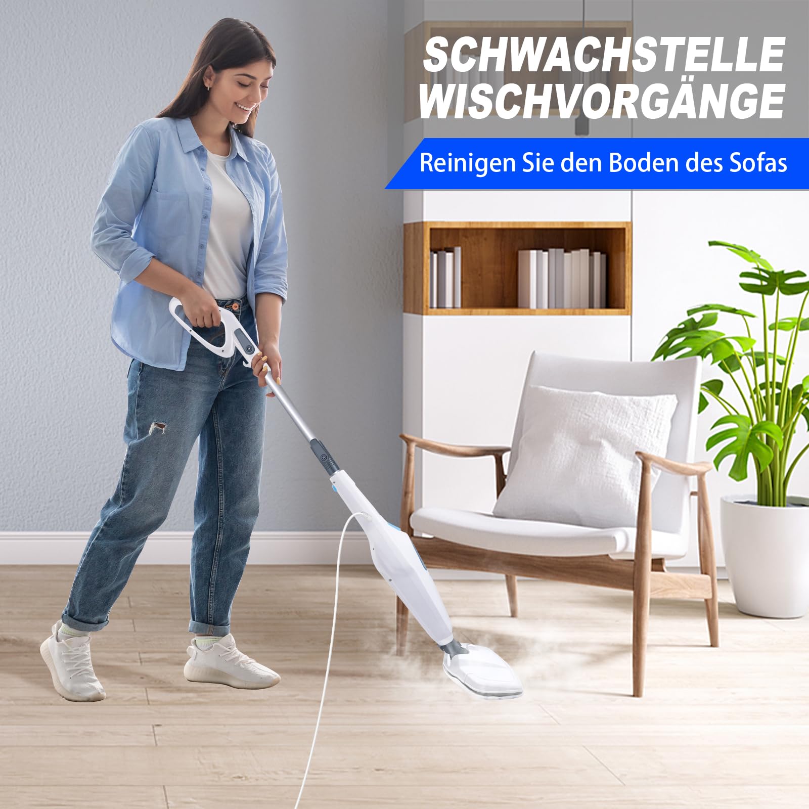 Funktion 2-in-1-Nass- und Trockenwischmopp: Effiziente Reinigung, freies Umschalten zwischen nasser und trockener Umgebung. 20 Sekunden Schnellheizung. Abnehmbarer Handdampfer. Die hohe Temperatur beseitigt wirksam Bakterien und Viren, Chemikalienfreie Reinigung vieler Arten von Oberflächen Kompakte und schwenkbare Dampfköpfe sind so konzipiert, dass sie in jede Ecke passen. Dank des gebogenen Griffs ist der Dampfreiniger leicht zu tragen. Spezielle Mikrofaser-Tuch bietet eine stärkere Reinigungsleistung als gewöhnliches Mopptuch. Dank des Teppichgleiters ist die Reinigung des Teppichs mühelos