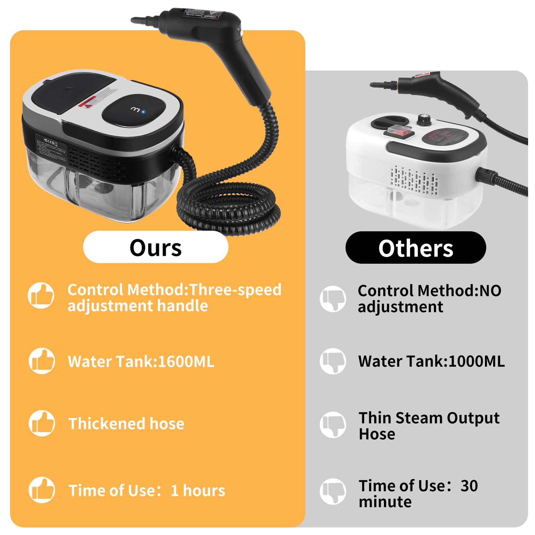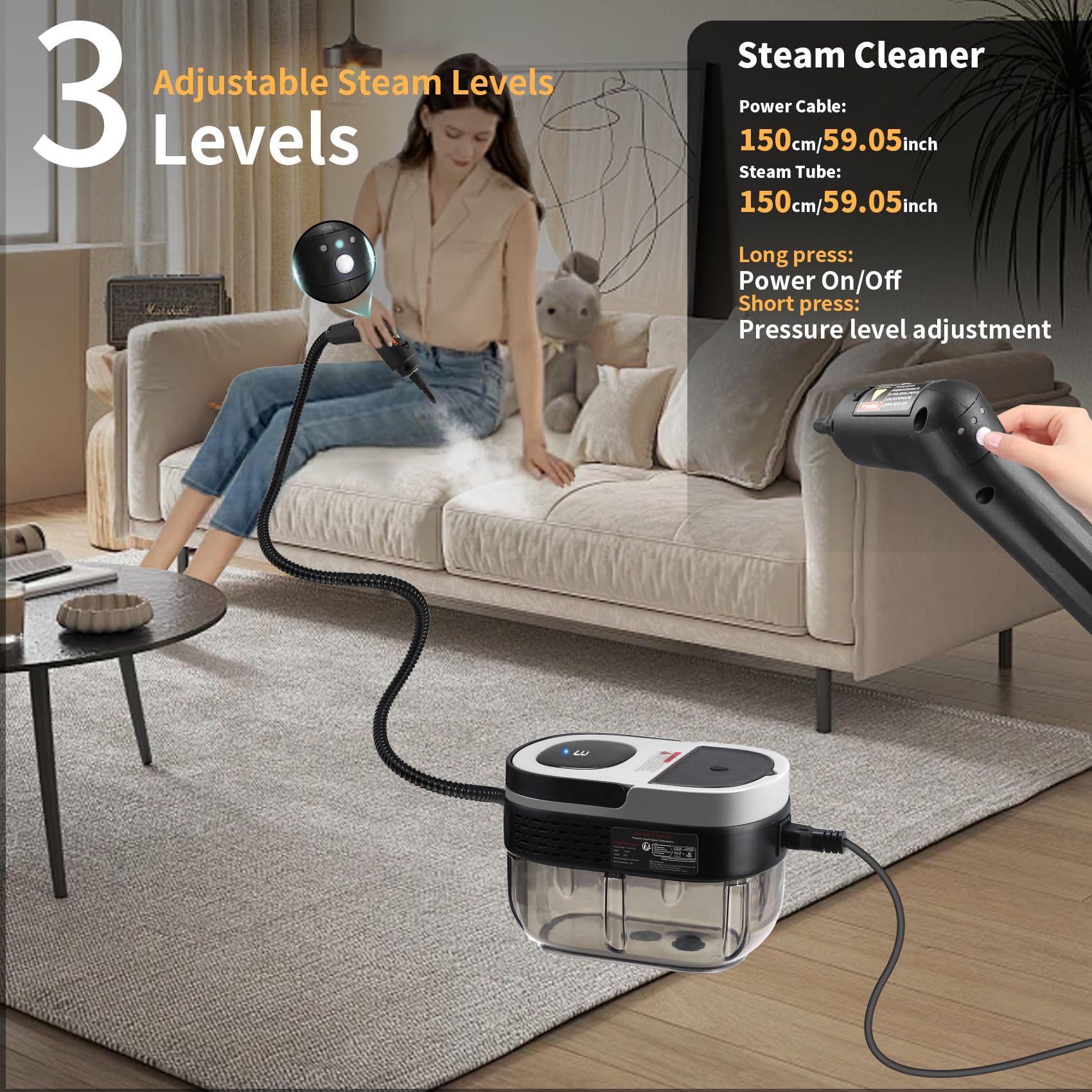 • UPGRADED SMART HANDLE DESIGN: Der Dampfreiniger für die Reinigung ist mit einem griffähnlichen, dreistufig einstellbaren Dampfregler ausgestattet, um eine präzise Leistung zu gewährleisten. Der Dampfreiniger für den Hausgebrauch ist mit einem 1600-ml-Wassertank ausgestattet, der eine längere Nutzung und weniger häufiges Nachfüllen ermöglicht. Mit einer Gesamtreichweite von 158 Zoll kann dieser unter Druck stehende Handdampfreiniger problemlos höhere oder weitere Bereiche erreichen und eignet sich für Aufgaben wie Dampfreiniger für Badezimmer, Wandböden und Möbel.