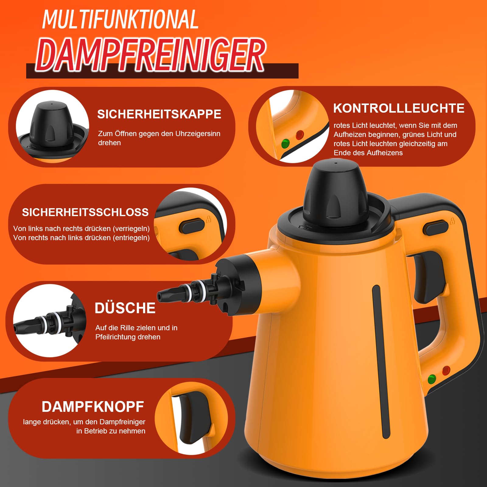 - SICHERE UND CHEMIKALIENFREIE REINIGUNG: Die 100% natürliche Reinigung erfolgt nur mit Wasser und gewährleistet, dass dieser Handdampfreiniger sicher in Haushalten mit Kindern und Haustieren verwendet werden kann. Unser Dampfreiniger Handgerät verfügt über eine Sicherheitsverriegelung am Griff und einen Sicherheitsverschluss für zusätzliche Sicherheit, um unnötige Probleme durch versehentliche Berührung zu verhindern