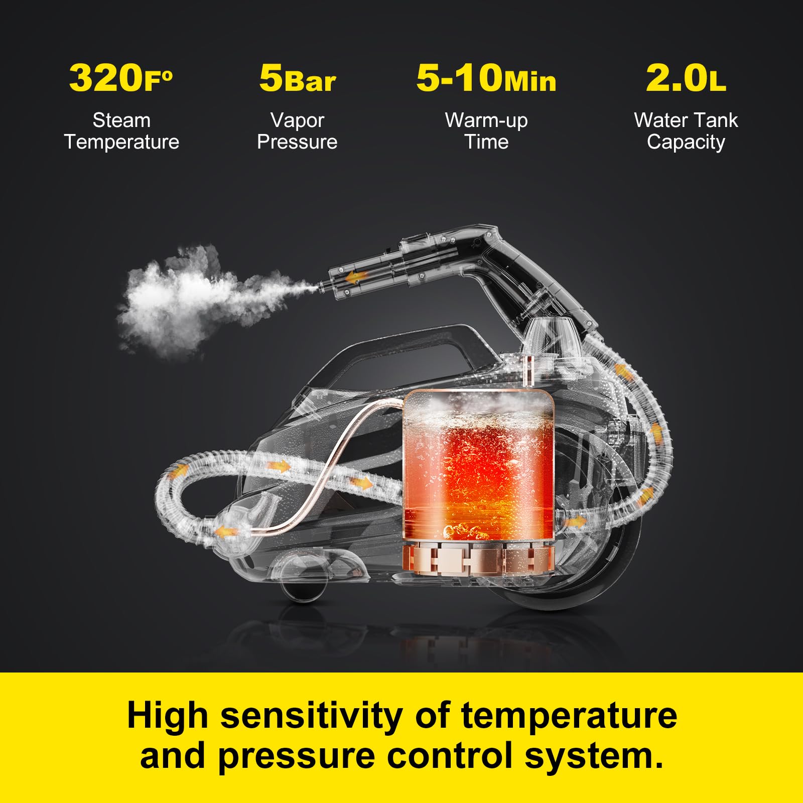 • Kraftvoller Fahrbarer Dampfreiniger: 2000 W Leistung, Fassungsvermögen des Wassertanks bis zu 2 L. Dampf mit hohem Druck (160°C) für 20 Minuten! Schneiden Sie mit unserem Hochdruckverdampfer durch Fett, Mörtel oder Flecken! Wir empfehlen, 1.8 L Wasser hinzuzufügen, um ein Überkochen von kochendem Wasser zu verhindern