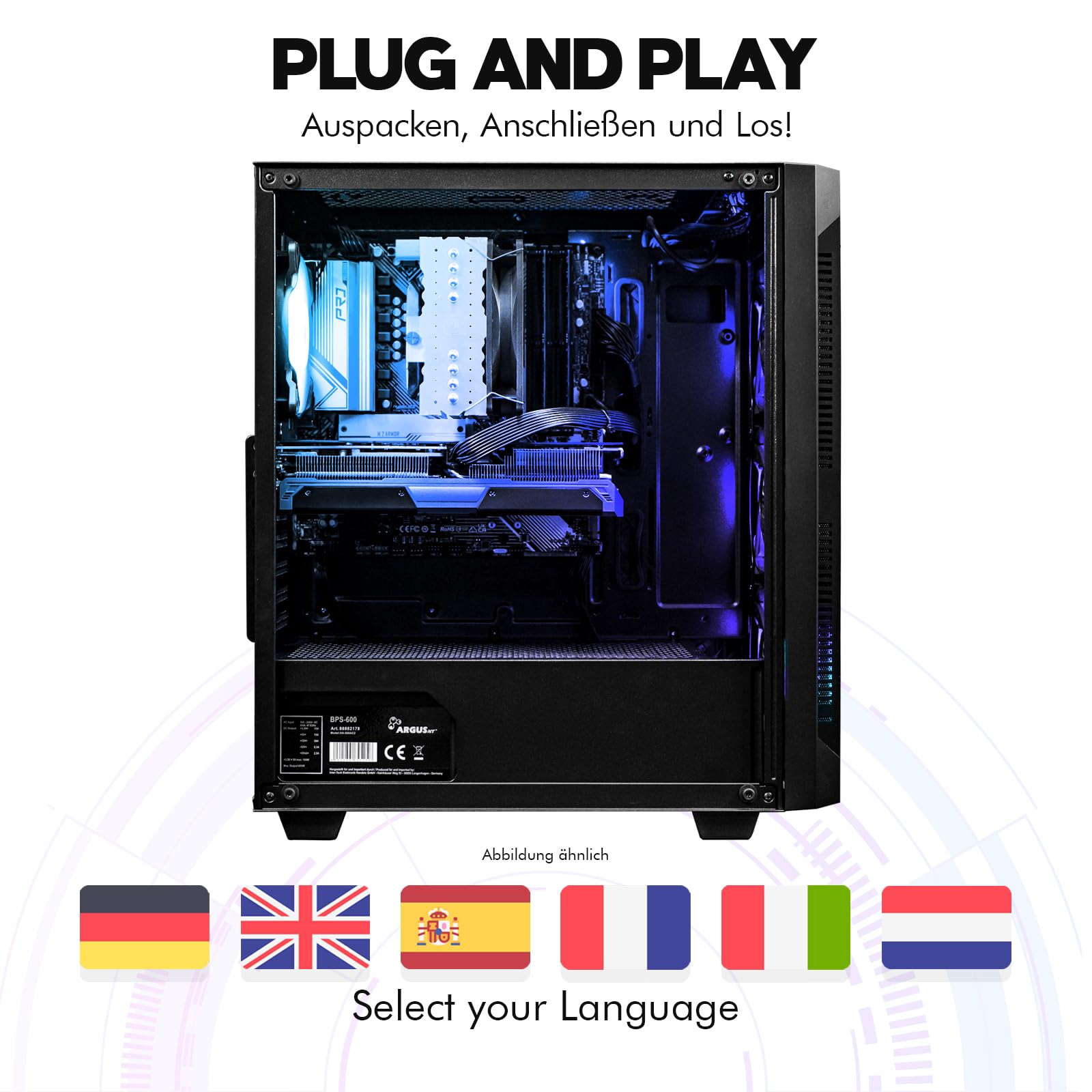 • Individuelle Farbgestaltung möglich - Das Gehäuse ist schwarz mit einer RGB Beleuchtung, sowie vier RGB-LED-Lüfter. Die Beleuchtung kann über die RGB Steuerung am PC geändert oder ausgeschaltet werden