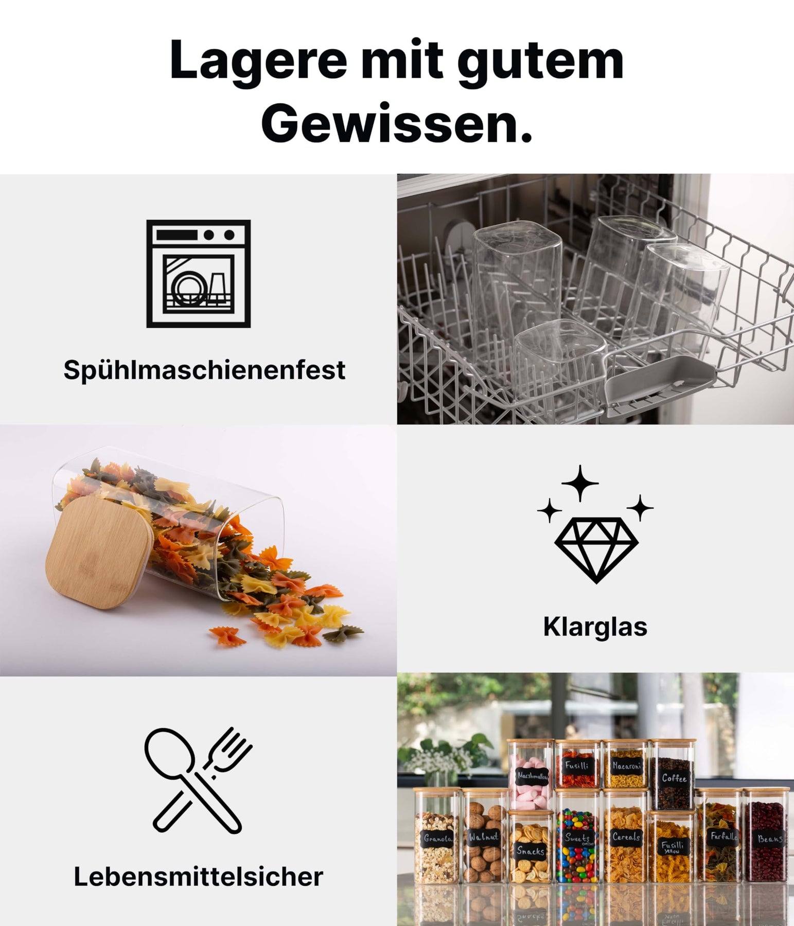 • LEBENSMITTELECHT - Unsere vorratsbehälter glas eckig bestehen aus hochwertigem Borosilikatglas, die Deckel sind aus Bambus mit Dichtung – zum Aufbewahren Mehl, Müsli, Cornflakes, Zucker, Nudeln, Spaghetti