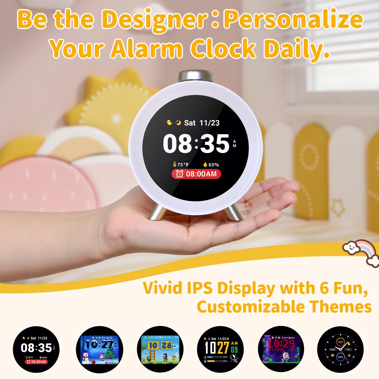 - 🎨 IPS-Farbdisplay mit 6+ interaktiven Themen – Bunte Animationen (Astronaut, Ritter, Weihnachtsmann, Raumschiff…) machen das Aufstehen spannend. Klare Anzeige von Uhrzeit, Datum, Temperatur & Luftfeuchtigkeit.