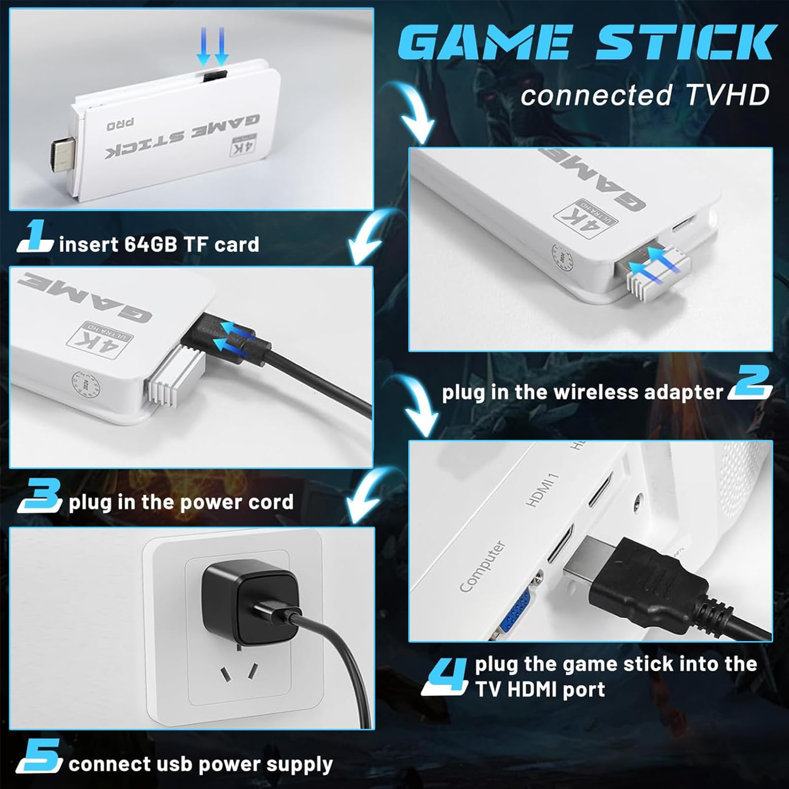 • [HDMI-AUSGANG UND 4K HD DISPLAY] : Diese Retro-Simulator-Spielkonsole unterstützt 4K/1080P/720P HDTV-Videoausgang, der klare und realistische Bilder liefert. Dieser 4k Game Stick wird mit einem verlängerten HDMI-Kabel geliefert und ist mit einer Vielzahl von Geräten wie Fernsehern, Monitoren, Computern und Projektoren kompatibel.