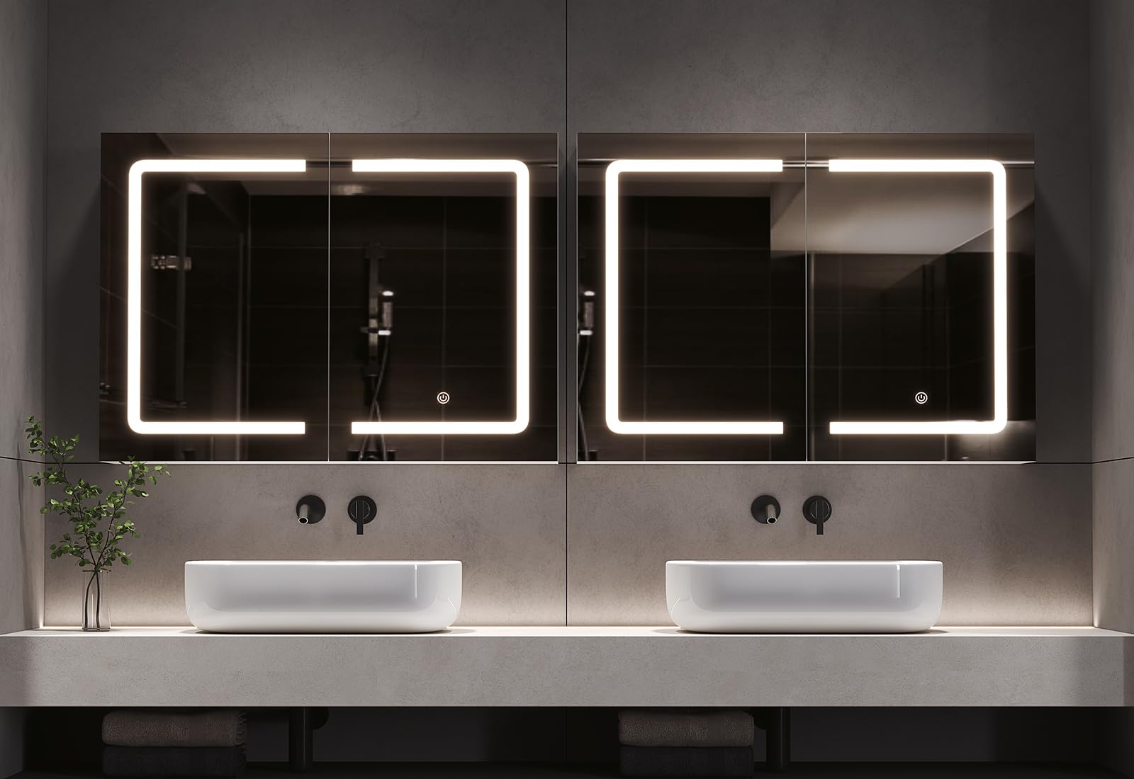 - 【Mit Steckdose】Befindet der unteren rechten Ecke der Innenseite des Spiegelschrank eine praktische Kombination aus Lichtschalter und Steckdose.Die nicht nur verhindert Wasser tritt nicht in die Steckdose ein,aber auch bequem zum Aufladen des Rasierers oder die Verwendung des Haartrockners.Der Schalter im Schrank ist der Hauptsteuerschalter, der die Stromversorgung des Badezimmerspiegelschranks steuert. Wenn Sie die Steckdose nicht verwenden, können Sie sie aus Sicherheitsgründen ausschalten.
