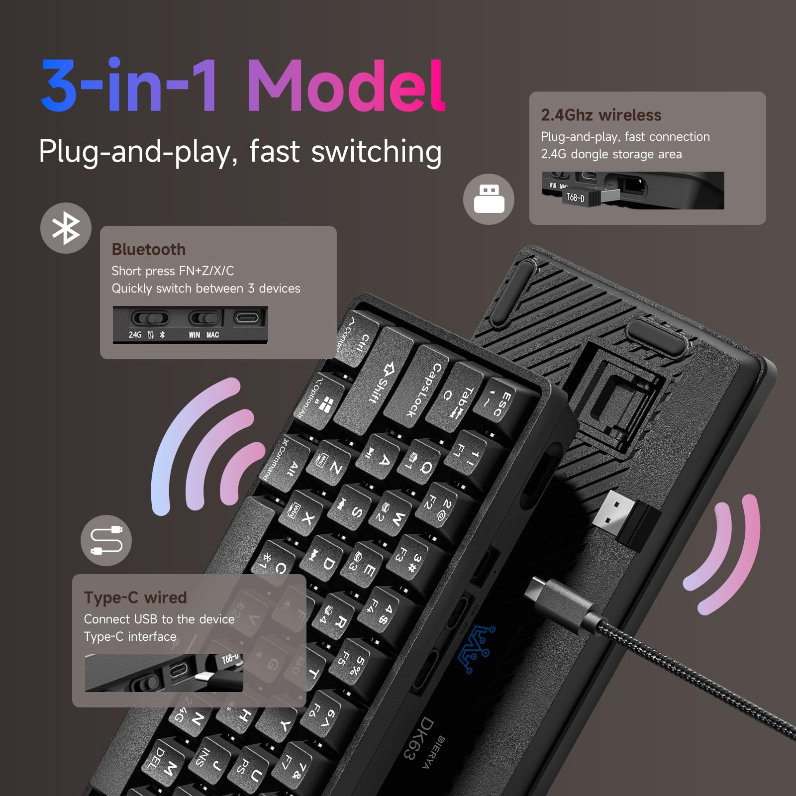 Dierya DK63 Gaming Tastatur,60% Kabellos Mechanische Tastatur mit Bluetooth/2.4G/Typ-C,Compact 63 Tasten Anti-Ghosting,RGB-Hintergrundbeleuchtung,US Layout,Linear Red Switch,Schwarz