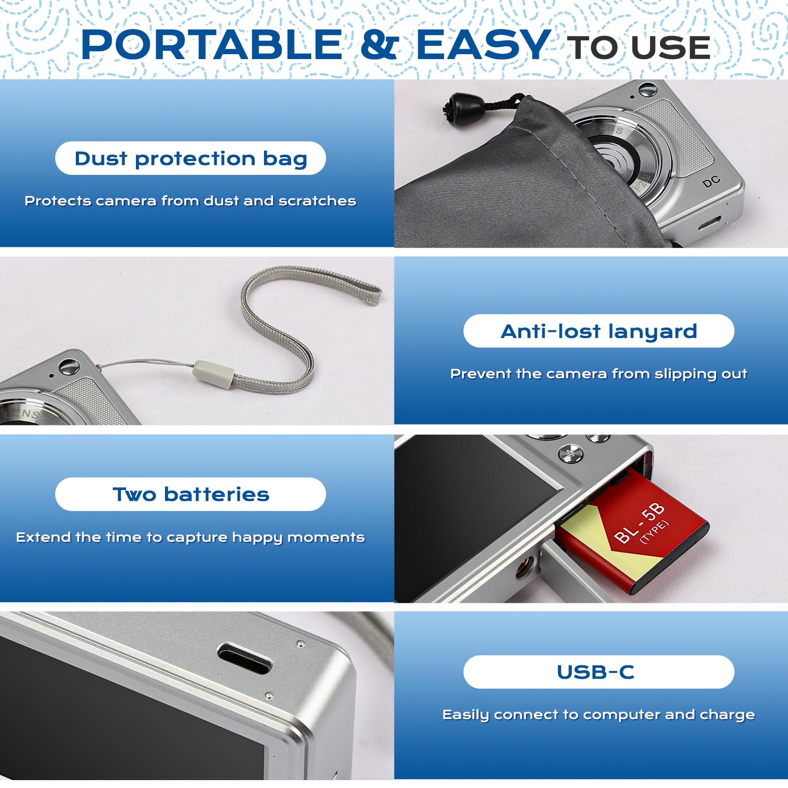 - 【Tragbarkeit und Haltbarkeit】: Dank des kompakten und leichten Designs lässt sich diese kompaktkamera problemlos überallhin mitnehmen. Sie ist robust genug für den täglichen Gebrauch und klein genug, um in Ihre Tasche zu passen, was sie zu Ihrem idealen Begleiter im Alltag macht.