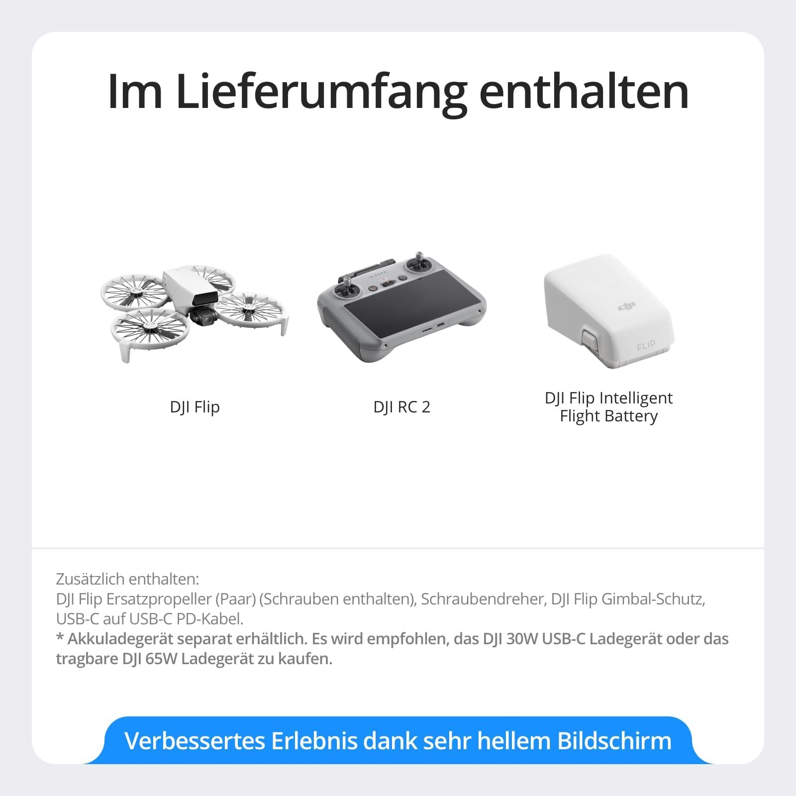 DJI Flip Fly More Combo (DJI RC 2) enthält DJI Flip, eine RC 2-Fernsteuerung mit einem sehr hellen Bildschirm, drei Akkus für eine längere Flugzeit, eine Parallel-Ladestation und mehr.
