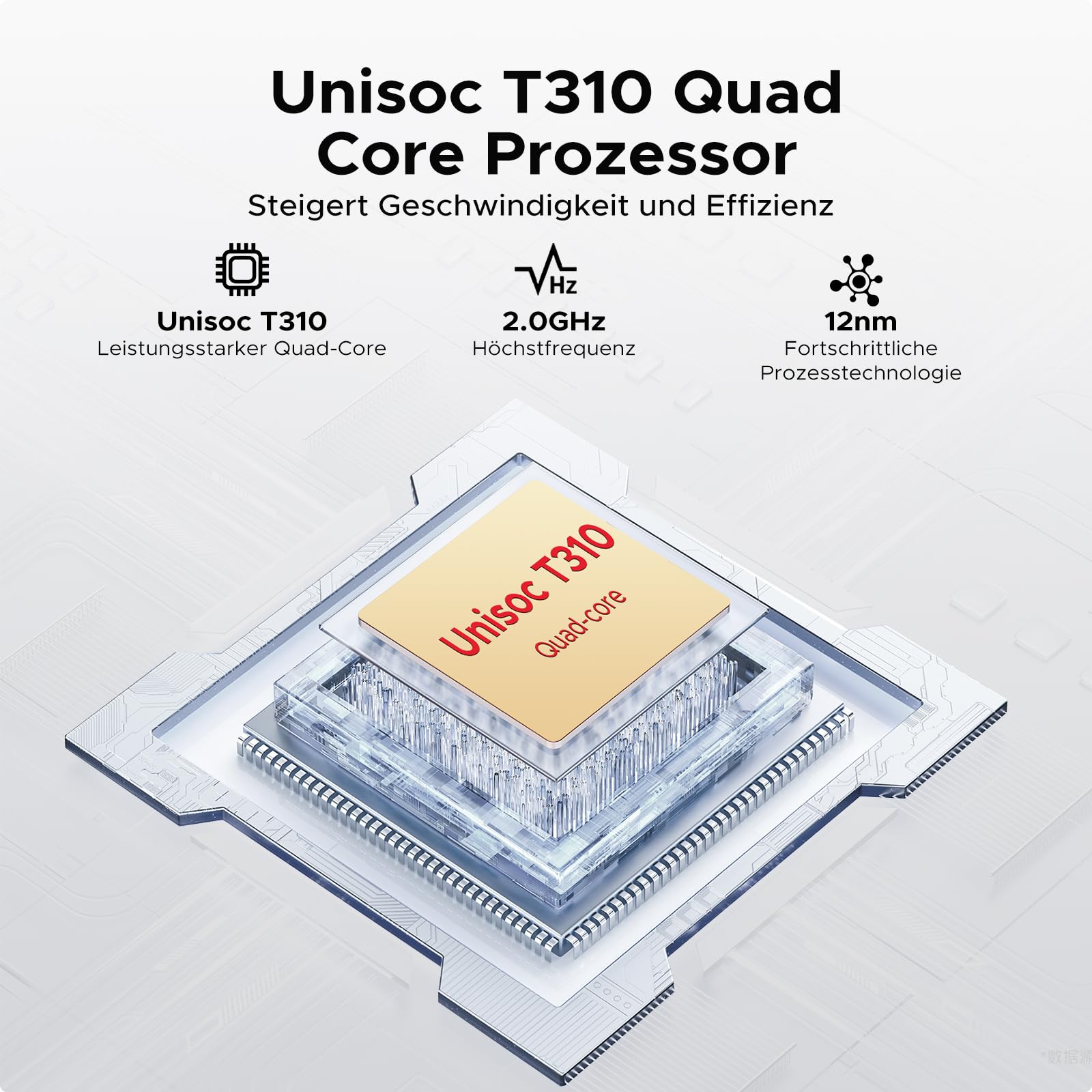 - UNISOC T310 Prozessor: Das DOOGEE Tab A9 Tablet 10+ zoll wird durch den neuesten UNISOC T310 Quad-Core Prozessor, den neuesten Chip basierend auf der ARM Dynamiq Architektur, angetrieben. Es verfügt über einen leistungsstarken 2,0-GHz-Cortex-A75-Kern. Diese einzigartige Konfiguration liefert einen Anstieg von 120% in Einzelkern. Darüber hinaus ist der T310 für einen geringen Stromverbrauch ausgelegt, was zu einer geringeren Wärmeerzeugung und einer längeren Akkulaufzeit führt