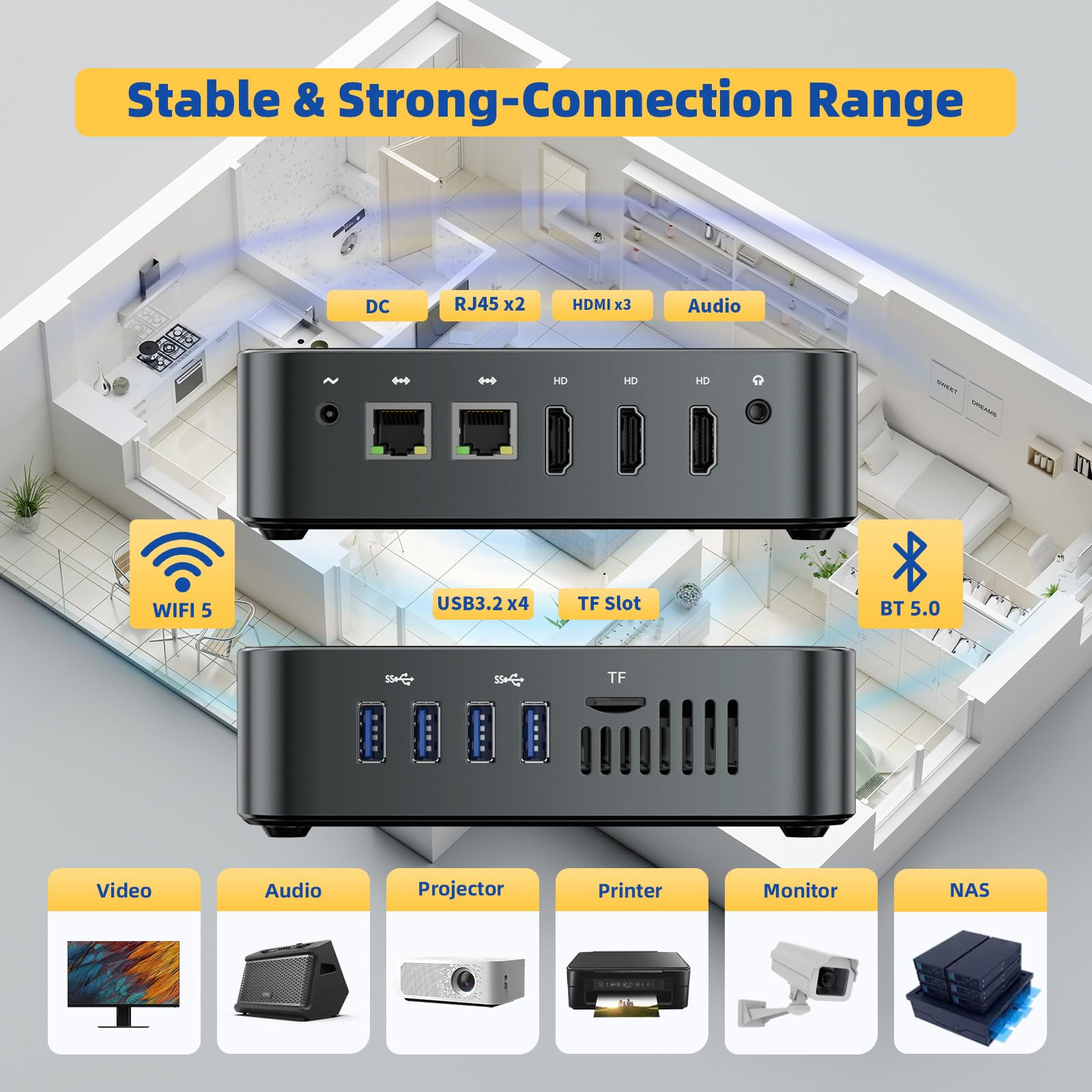 - 🚀【Exzellentes UHD 4K Triple-Screen Display】Der Mini Computer verfügt über 3 eingebaute HMDI 2.0 Schnittstellen, ultra-hochauflösende Intel UHD Graphics 600, unterstützt Multitasking und ermöglicht es Ihnen, drei Bildschirme einfach anzuschließen und anzuzeigen. Der Mini Desktop PC verfügt über zwei Netzwerkanschlüsse (getrennte interne und externe Netzwerke) und 2.4G+5G WiFi, um mehr Bereiche abzudecken und Ihre Netzwerkanforderungen zu erfüllen. Erheblich verbesserte Arbeitseffizienz!