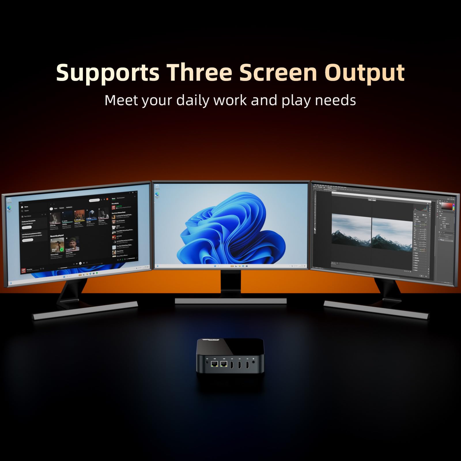 - 【4K-Drei-Bildschirm-Ausgabe,immersives Erlebnis】Die verbesserte Intel-Grafikkarte (1000 MHz) unterstützt die 4K-Videowiedergabe und AV1-Dekodierung und präsentiert ein feines und lebensechtes Bild. Drei HDMI-Anschlüsse unterstützen die 4K-Dreifachbildschirmanzeige bei 60 Hz und machen Multitasking bei der Arbeit effizienter. Schließen Sie für Heimunterhaltung einen Projektor oder Fernseher an, um ein privates Heimkino zu schaffen und ein beeindruckendes audiovisuelles Erlebnis zu genießen.