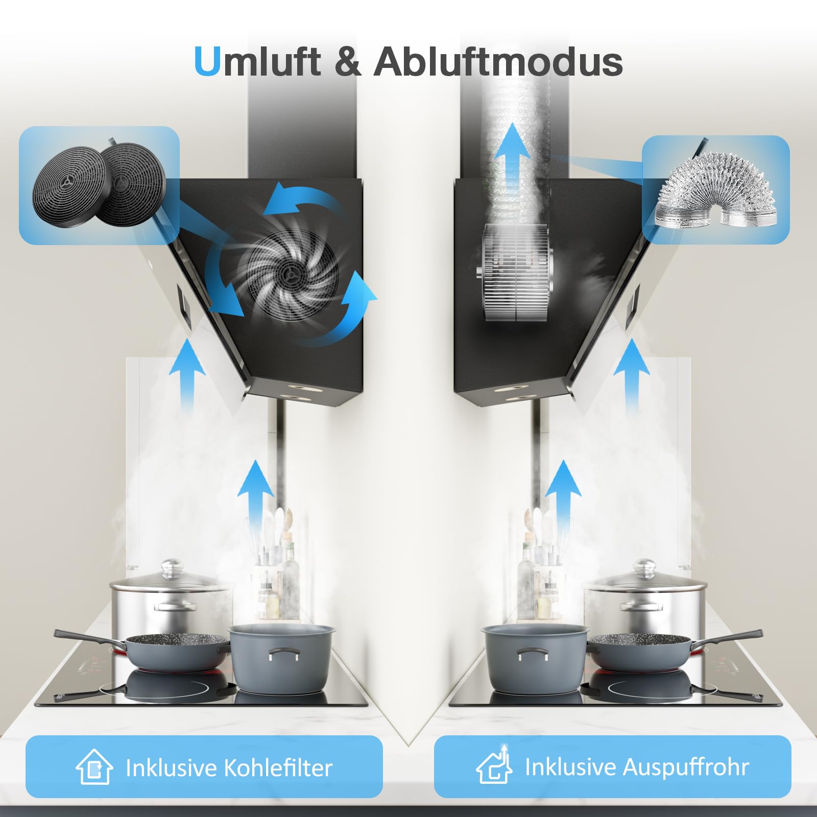 - ❤️【2-Modus-Entlüftungssystem】: Sie können den Umluftmodus oder den Abluftmodus verwenden. Die 90cm Dunstabzugshaube umfasst Kohlefilter (*2) und ein Auspuffrohr (2m). Zwei 1.5W-LED-Leuchten können Ihren kochbereich jederzeit beleuchten.