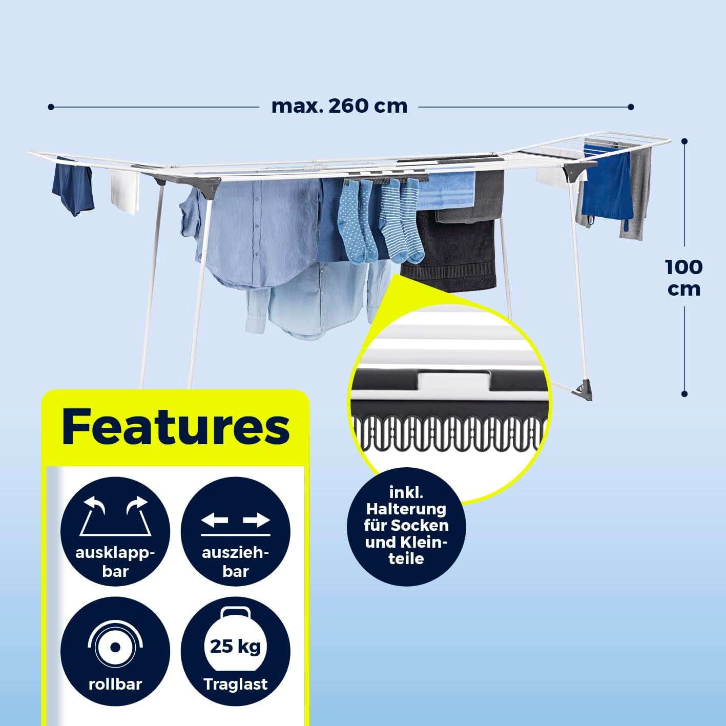• FÜR 2 BIS 3 WASCHLADUNGEN: Der Flügelwäscheständer hat eine Gesamttraglast von 25 kg – optimal für Familien mit viel Wäsche. Dank der Kleinteilehalterung ist der Ständer auch perfekt für Socken u. v. m. Auch zum Aufhängen von Bügelwäsche an Kleiderhaken und zum Outdoor-Auffrischen getragener Wäsche.