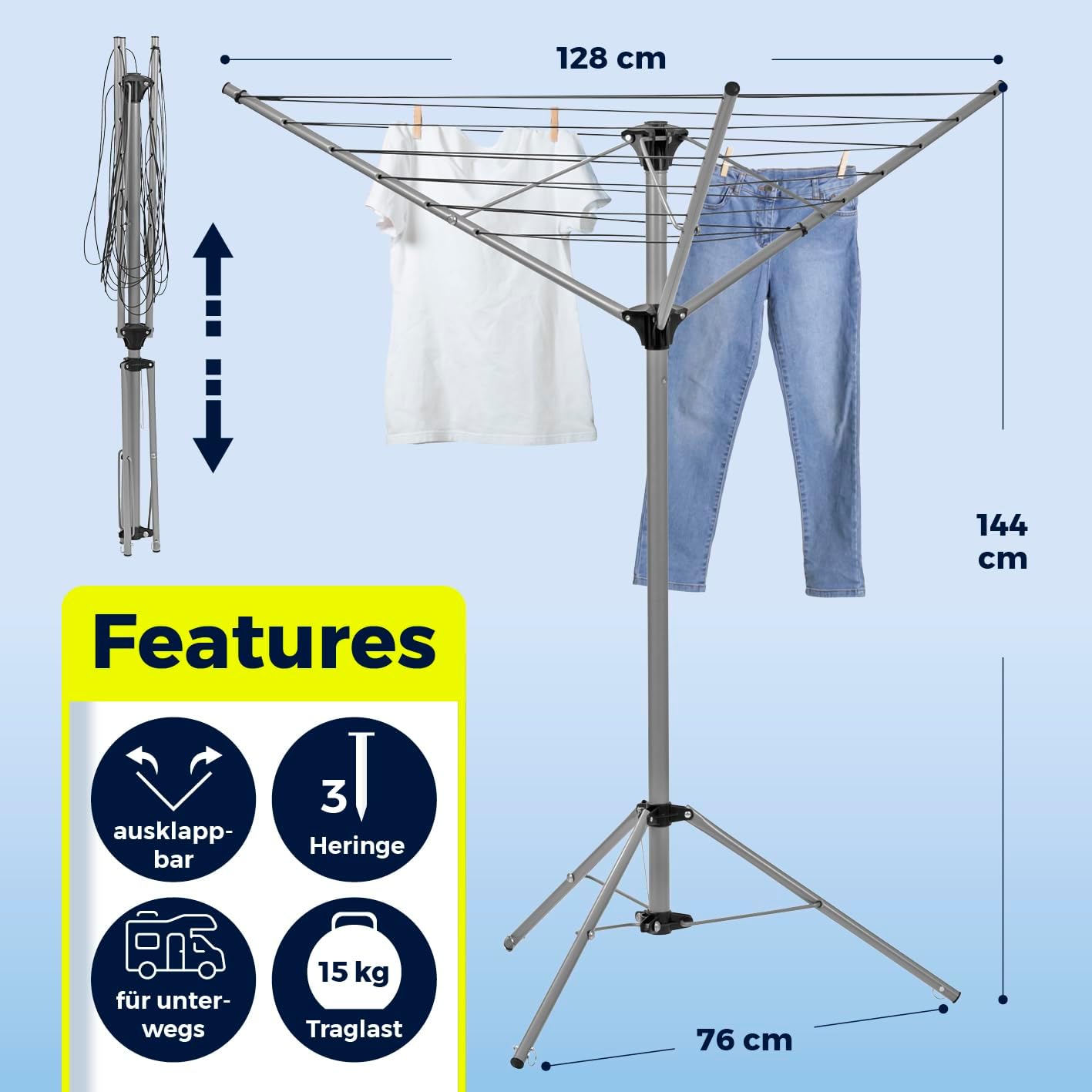 • PLATZSPAREND - Die Wäschespinne lässt sich schnell und einfach zusammenklappen und platzsparend verstauen. Maße zusammengeklappt: ca. 132cm x 14cm.