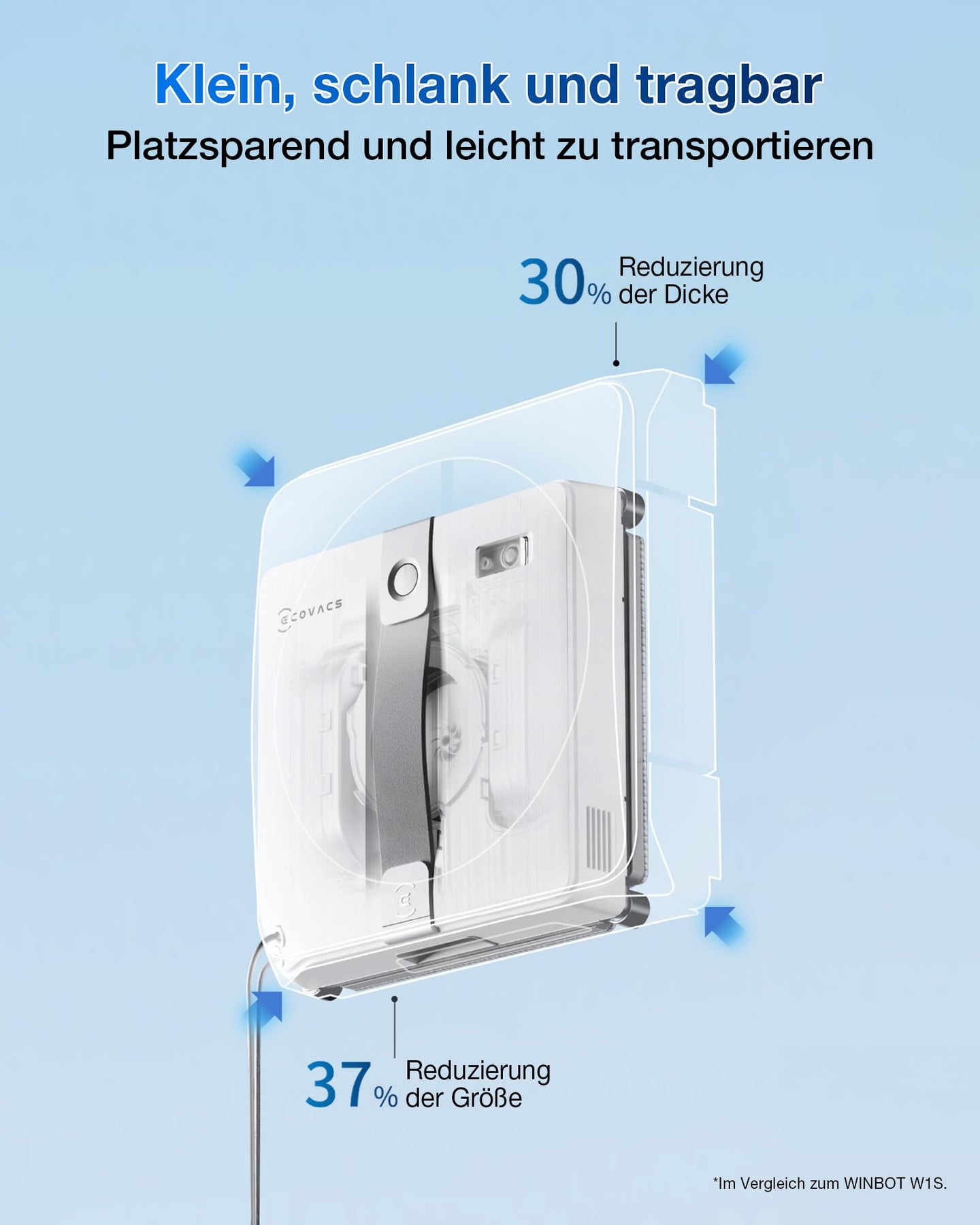 - 【Schlankes & kompaktes Design】Durch sein einzigartig kleines und dünnes Design kann der WINBOT MINI neben bodentiefen, rahmenlosen oder kippbaren Fenstern nun auch Bereichen abdecken, die größere Fensterputzroboter bislang nicht erreichen konnten. Der WINBOT MINI kann sehr kleine Fenster mit einer einzigen Seitenlänge von weniger als 30 cm reinigen und auch unterhalb von Fenstergriffen (der Abstand zwischen Griff und Glas beträgt etwa 50 - 80 mm).