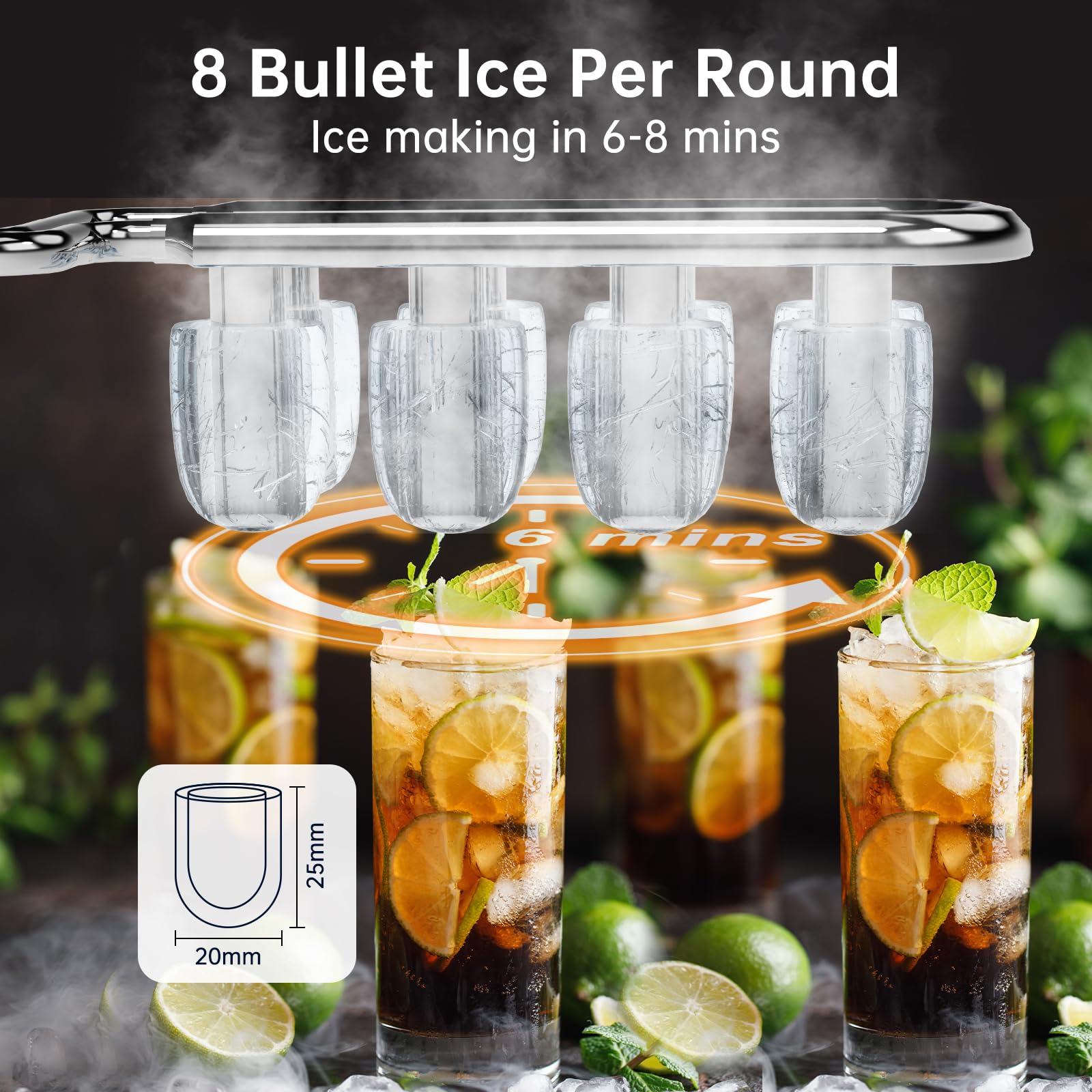 • 【Schnelle Eisherstellung in 6 Minuten】Der leistungsstarke 120W Eiswürfelbereiter produziert 8 kugelförmige Eiswürfel in nur 6 Minuten und bis zu 12 kg Eiswürfel in 24 Stunden. Damit haben Sie an heißen Sommertagen jederzeit unbegrenzt Eis zur Verfügung, perfekt für den eigenen Gebrauch und die Bewirtung von Gästen.