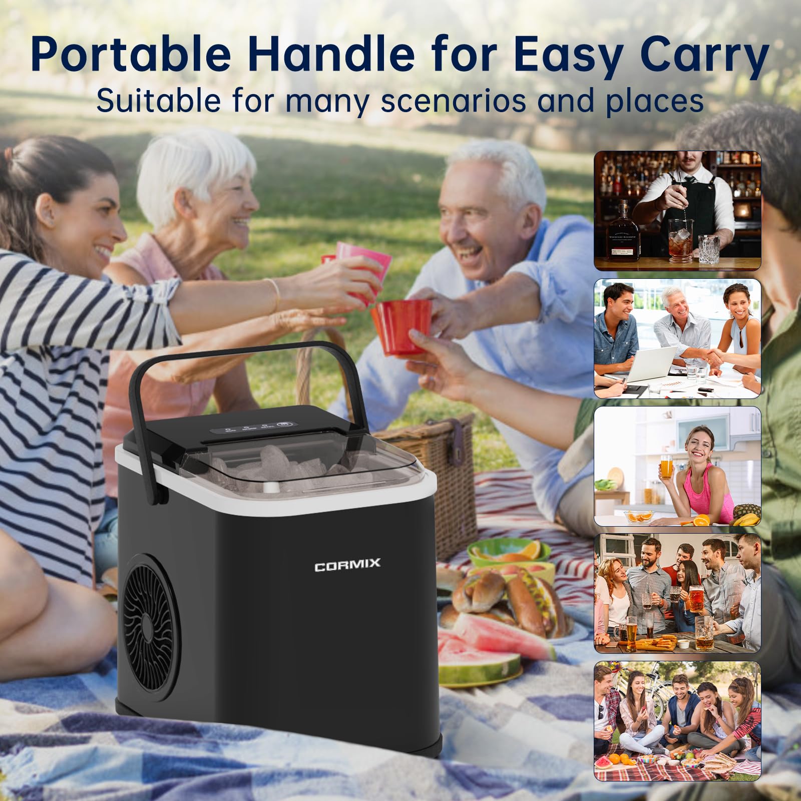 • 【Kompakt und tragbar】Der Ultra Compact Eiswürfelbereiter ist kleiner und leichter als herkömmliche Tisch-Eiswürfelbereiter und lässt sich daher leicht verstauen. Der abnehmbare Tragegriff Design macht es einfach zu tragen und kann mit einer Hand weggenommen werden, perfekt für den Einsatz bei Grillpartys und im Freien Parteien.