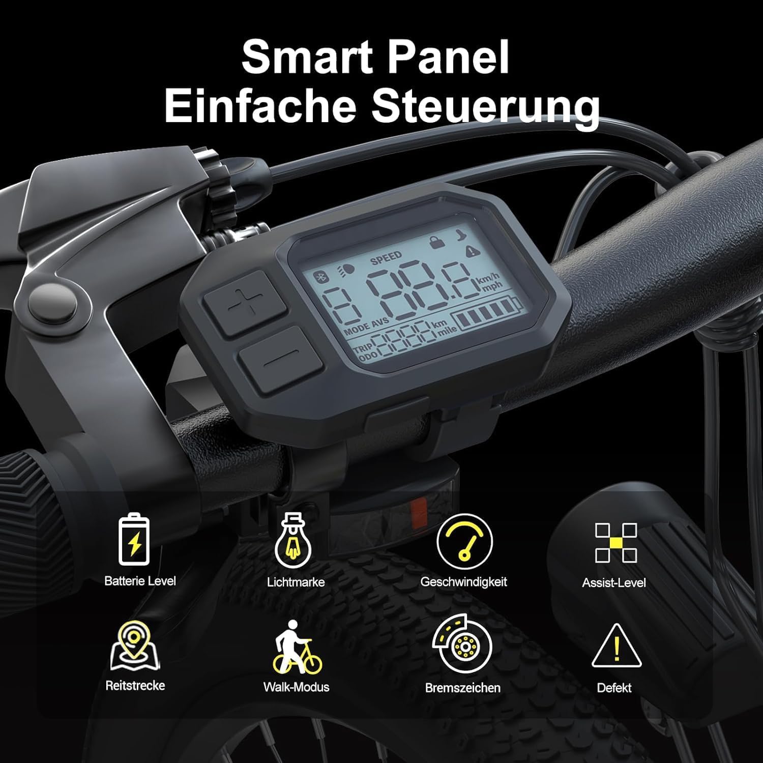 【𝐈𝐧𝐭𝐞𝐥𝐥𝐢𝐠𝐞𝐧𝐭𝐞𝐬 𝐃𝐢𝐬𝐩𝐥𝐚𝐲 𝐮𝐧𝐝 𝐞𝐢𝐧𝐟𝐚𝐜𝐡𝐞 𝐒𝐭𝐞𝐮𝐞𝐫𝐮𝐧𝐠】Das E-Bike ist mit einem intelligenten LCD-Display ausgestattet, das alle wichtigen Informationen wie Geschwindigkeit, Strecke und verbleibende Batterieleistung in Echtzeit anzeigt. Mit den vielseitigen Einstellungsmöglichkeiten können Sie die Unterstützungsstufen leicht anpassen und den Gehmodus aktivieren.