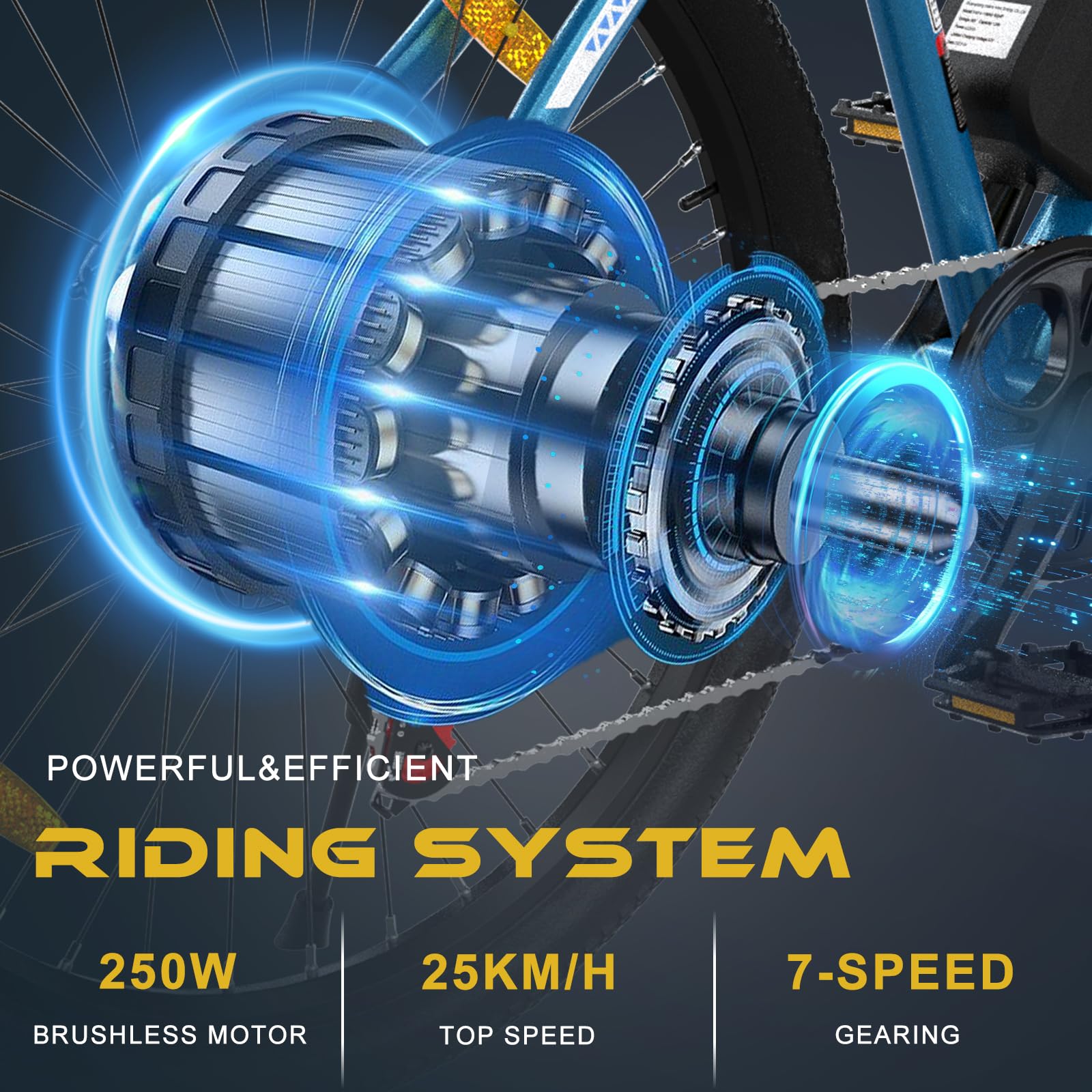 • Hohe Leistung: ELEKGO EG15 Elektro-Mountainbike mit einer Höchstgeschwindigkeit von 25 km/h. Der leistungsstarke 250-W-Motor ermöglicht Ihnen grenzenlosen Fahrspaß! Die Tretunterstützung sorgt für eine problemlose Fahrt in der Stadt und bei Fahrten im Gelände