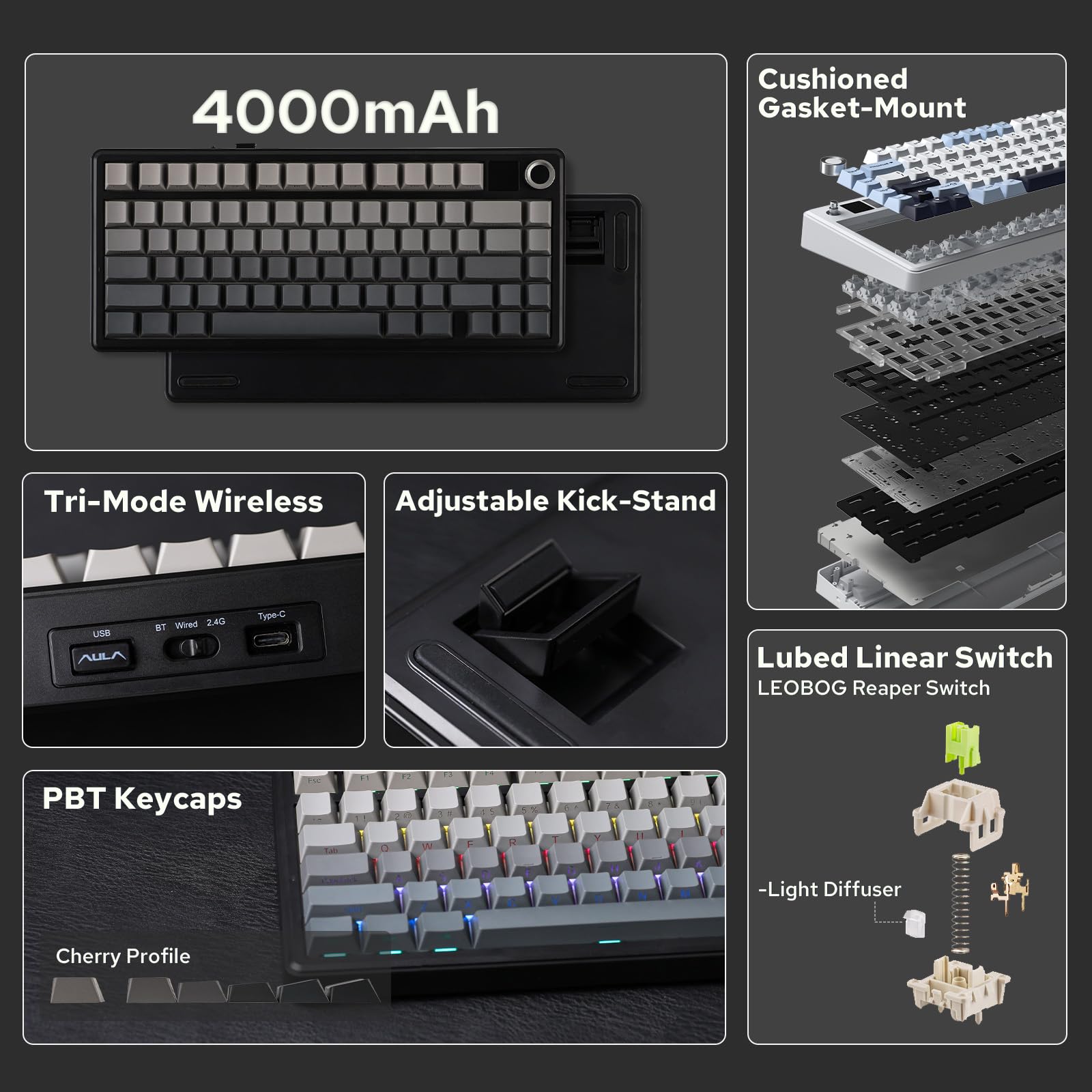 - Kompakte Größe, Kernfunktion: Mit 80 programmierbaren Tasten und einem anpassbaren Bildschirm ist die F75 Max ein Upgrade der erfolgreichen Vorgängers EPOMAKER X Aula F75 mit gleicher Zuverlässigkeit und unglaublichen neuen Funktionen. Genießen Sie den Komfort, den der Lautstärkeregler bietet, und den Bildschirm mit Gif-Anzeige, der die Anpassung der Hintergrundbeleuchtung zum Vergnügen macht. Die F75 Max-Tastatur mit TFT-Smart-Display vereint Konnektivität, Batterieüberwachung und Anzeigeleuchten in einem und wird so zu Ihrem unzertrennlichen Helfer und Produktivitätsverstärker beim Spielen und im Leben
