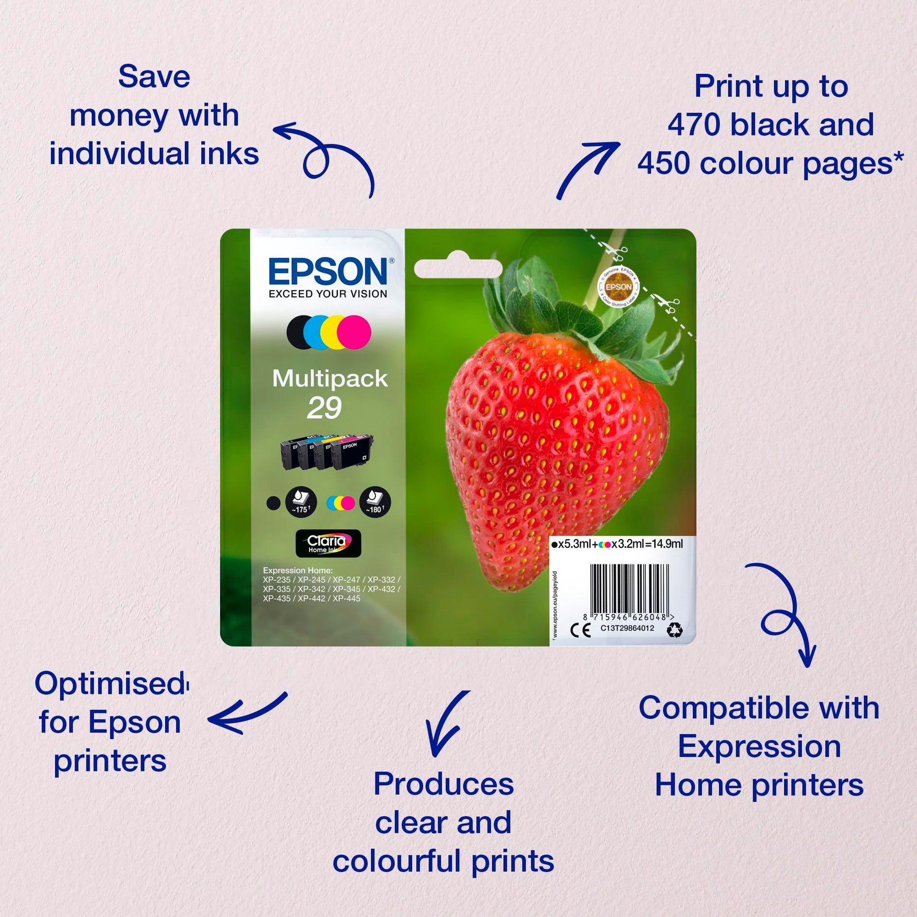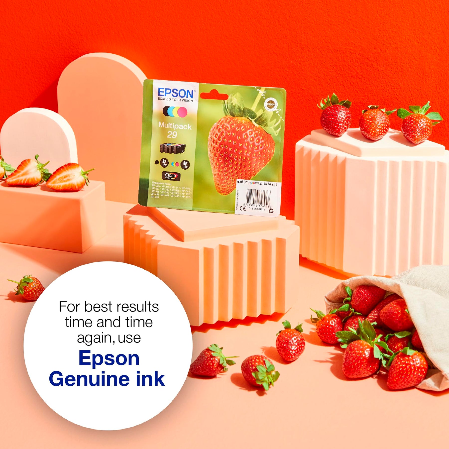 Epson Claria Home ink ist ein vielseitiges Tintenset mit vier Farben, Das gestochen scharfe Textdokumente und brillante Fotos in Laborqualität liefert. Es eignet sich ideal für kostengünstiges, zuverlässiges Drucken ohne Kompromisse.