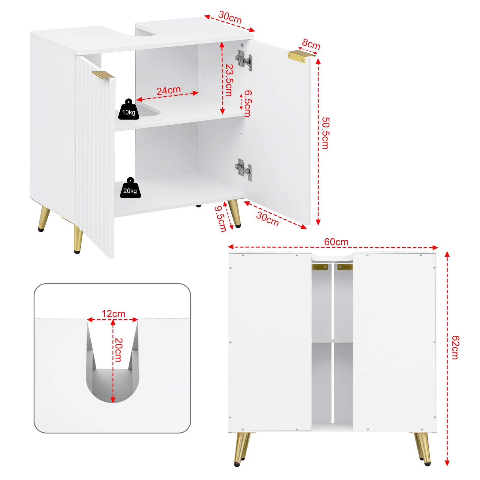 - Platzsparend: Der Badezimmerschrank mit den Maßen 60x62x30 cm ist kompakt und nutzt den Platz unter dem Waschbecken optimal aus, indem er auf zwei Ebenen versteckten Stauraum für Badutensilien bietet. Der Ausschnitt für den Siphon ist 12x20 cm groß. Bitte messen Sie zuerst die Größe Ihres Siphons.