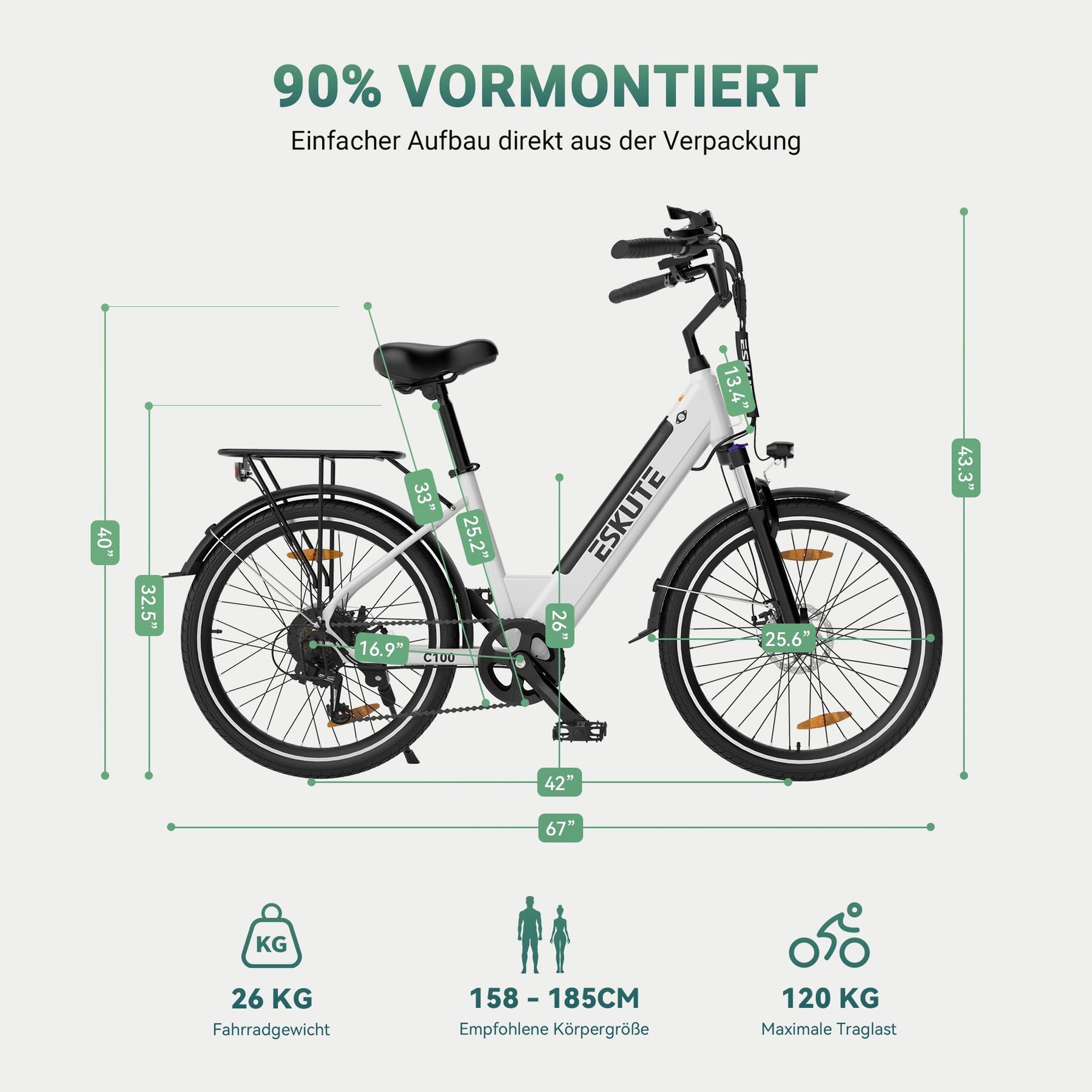 ESKUTE C100 E-Bike, 26 Zoll Elektrofahrrad, E-Cityrad 250W HeckMotor, 375Wh Wechselakku,bis zu 60km, LCD-Display, Tiefeinsteiger E-CityBike Für Damen und Herren Erwachsene Weiß